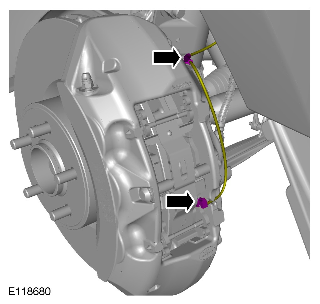 CAUTION: The brake pad wear indicator sensor, which is installed on the left hand side only, is easily damaged. Do not use a lever to remove the sensor.