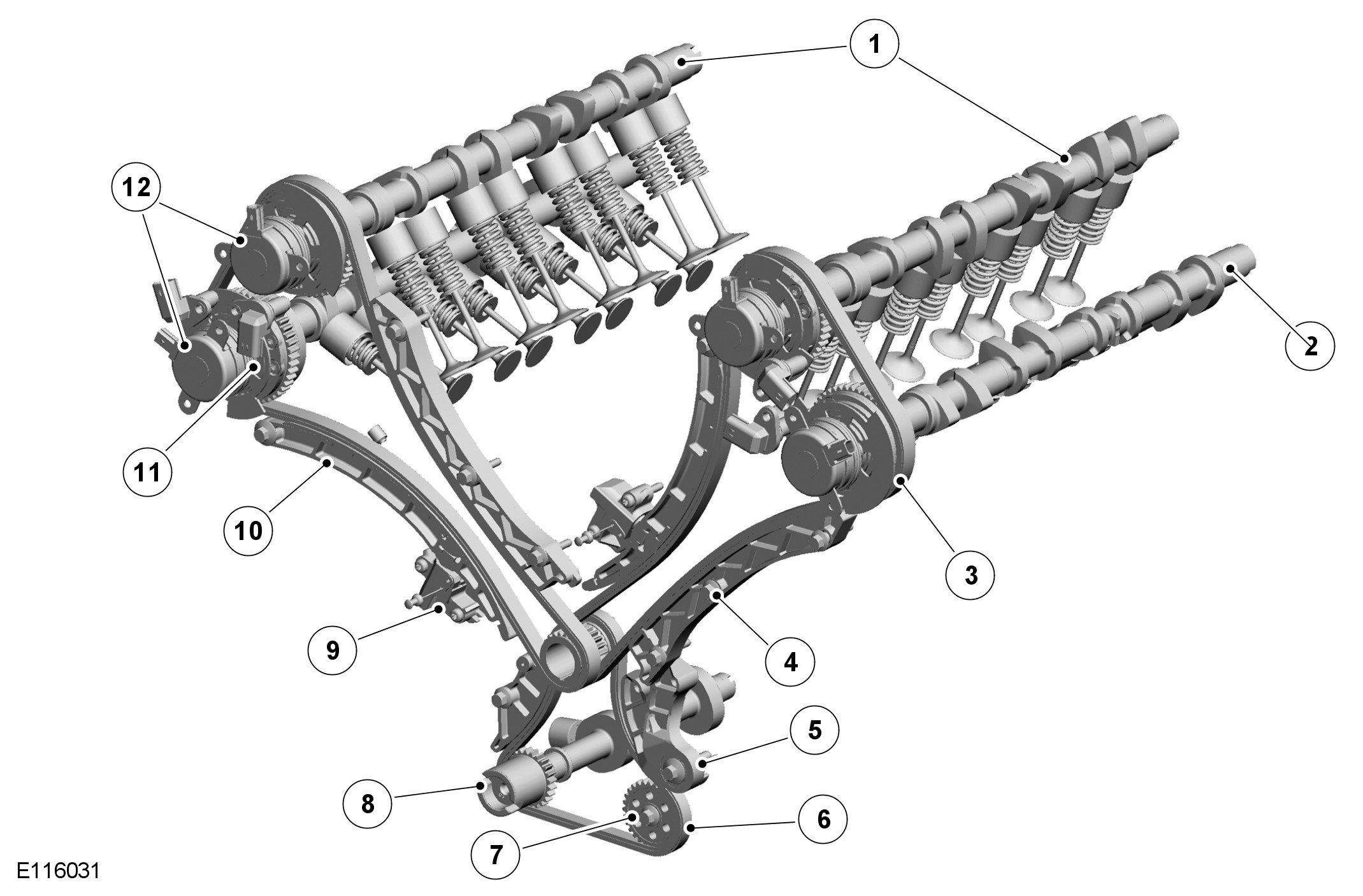 Double overhead camshafts on each cylinder head operate the valves. For each cylinder head, an inverted tooth timing chain transfers drive from the crankshaft to the VCT (variable camshaft timing) unit on the front of each camshaft. Graded tappets enable setting of inlet and exhaust valve clearances.