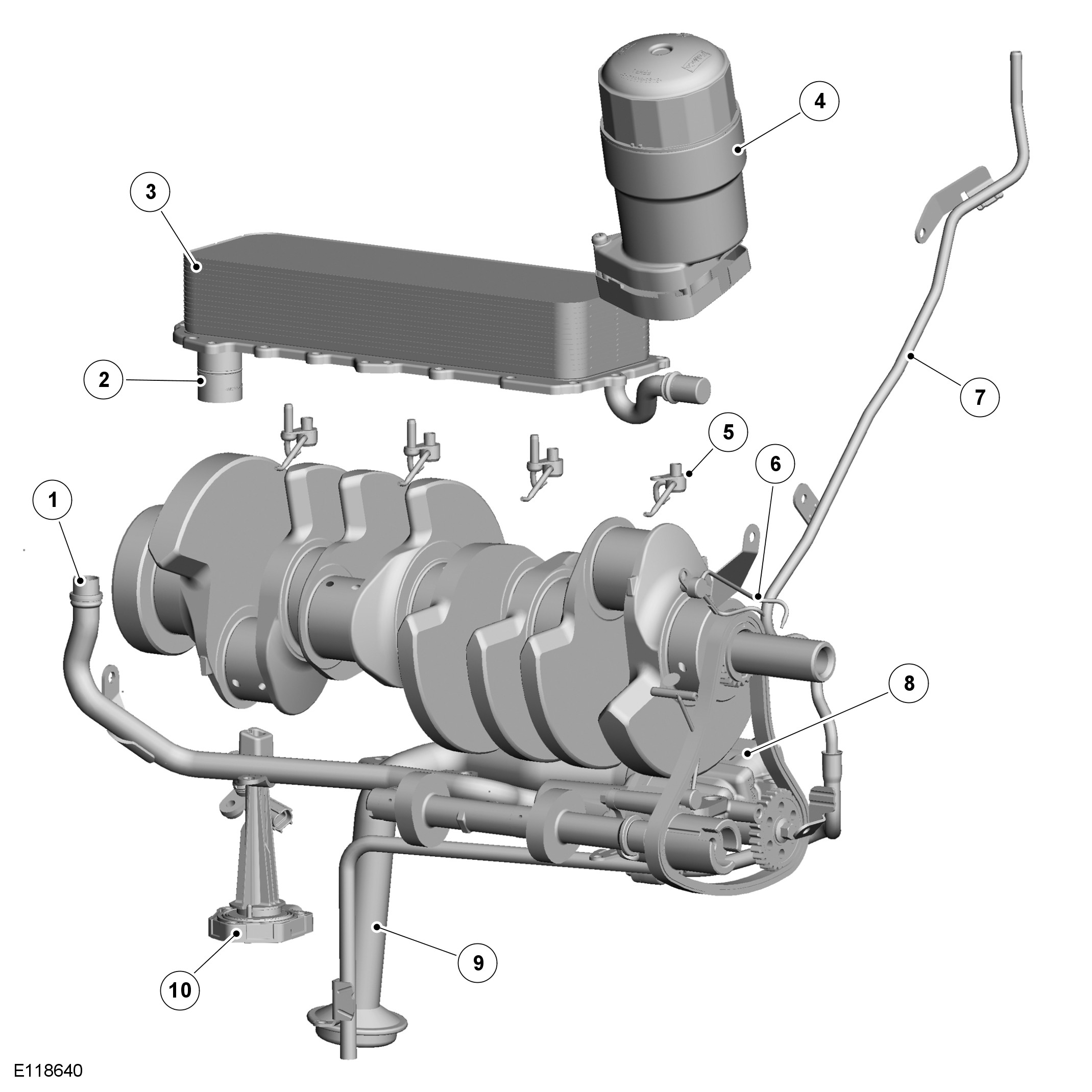 The output from the oil filter is distributed through oil galleries in the cylinder heads and cylinder block. All moving parts are lubricated by pressure or splash oil. Pressurized oil is also provided for the VCT (variable camshaft timing) system, the timing chain tensioners, the piston cooling jets and the timing chain lubrication jets.