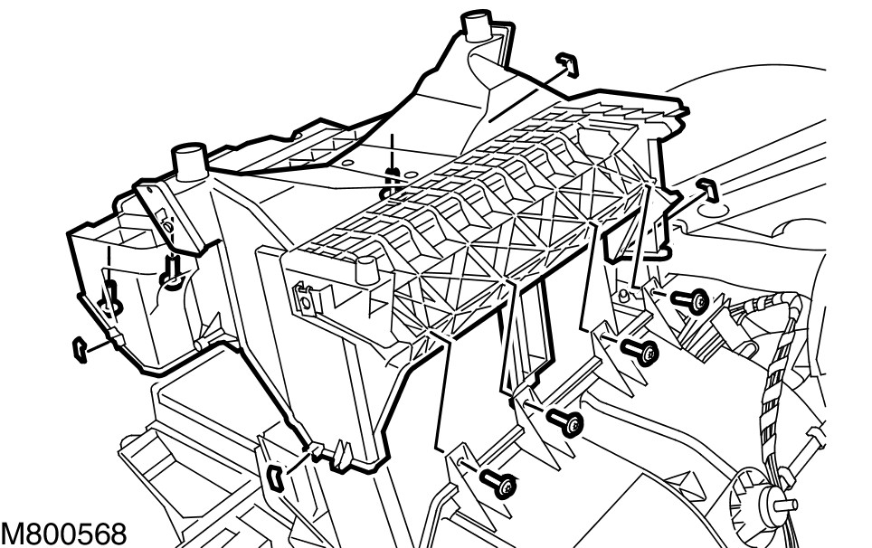 4 Remove the heater and evaporator core housing. For additional information, refer to Heater Core and Evaporator Core Housing - 5.0L SC V8 - AJ133 Heater Core and Evaporator Core Housing