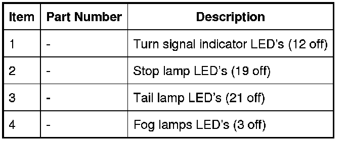 All lamps in the tail lamp assembly use LED's's. The stop lamp is located in the upper section of the lamp assembly and is illuminated by 19 LED's. Surrounding the stop lamp is the upper tail lamp which is illuminated by 9 LED's. The rear fog lamp is located in the lower section of the tail lamp assembly and is illuminated by 3 high power LED's. Surrounding the fog lamp is another circular ring of 12 LED's which function as the lower tail lamp. The turn signal indicators are 3 horizontal strips located between the upper and lower tail lamps and are illuminated by 12 LED's.