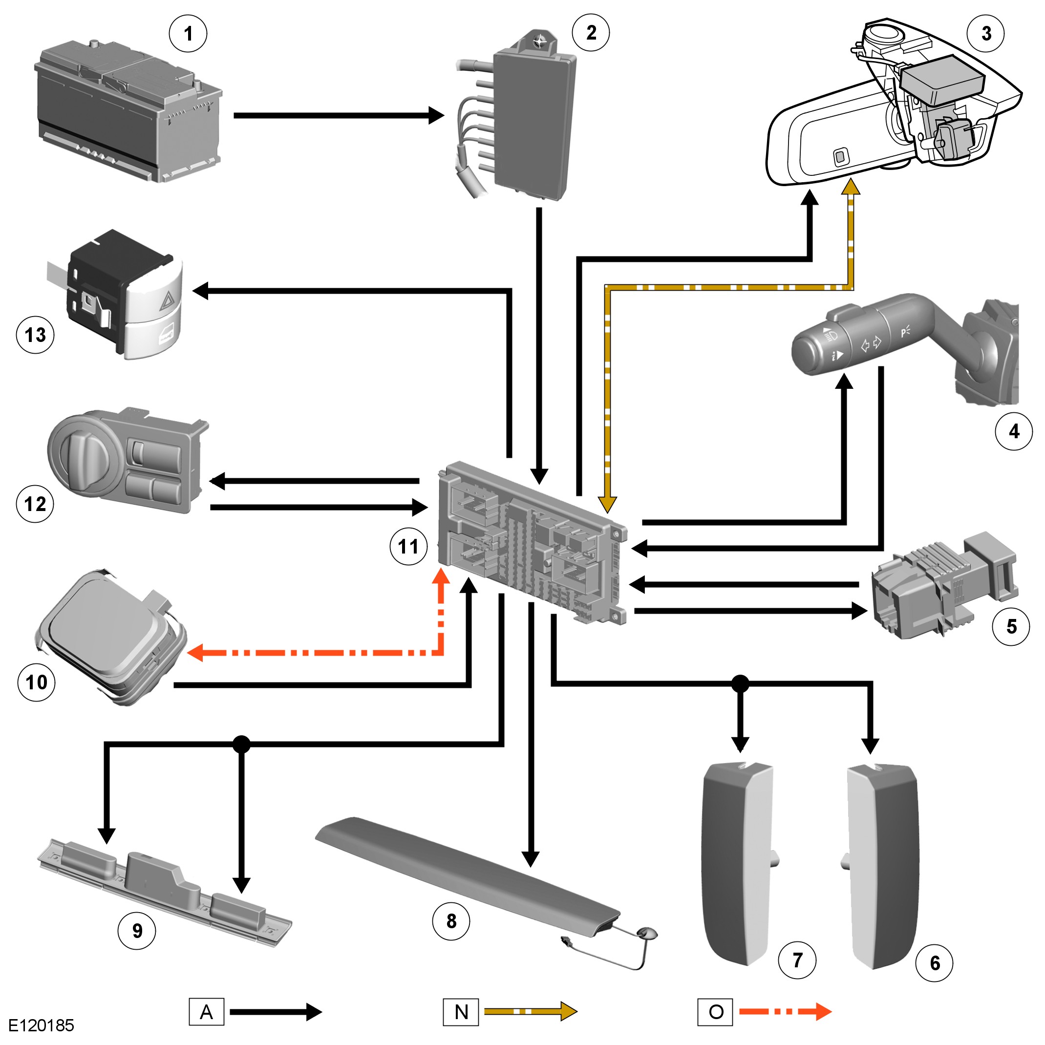 The warning indicators in the instrument cluster for left and right turn signal indicator, front and rear fog lamps and headlamp low and high beam and side lamps are activated by the CJB via messages to the instrument cluster on the medium and high speed CAN buses. The synchronization of the turn signal warning indicator with the external turn signal indicator lamp frequency is controlled by a cyclic transmission of the light status on the medium speed CAN bus.