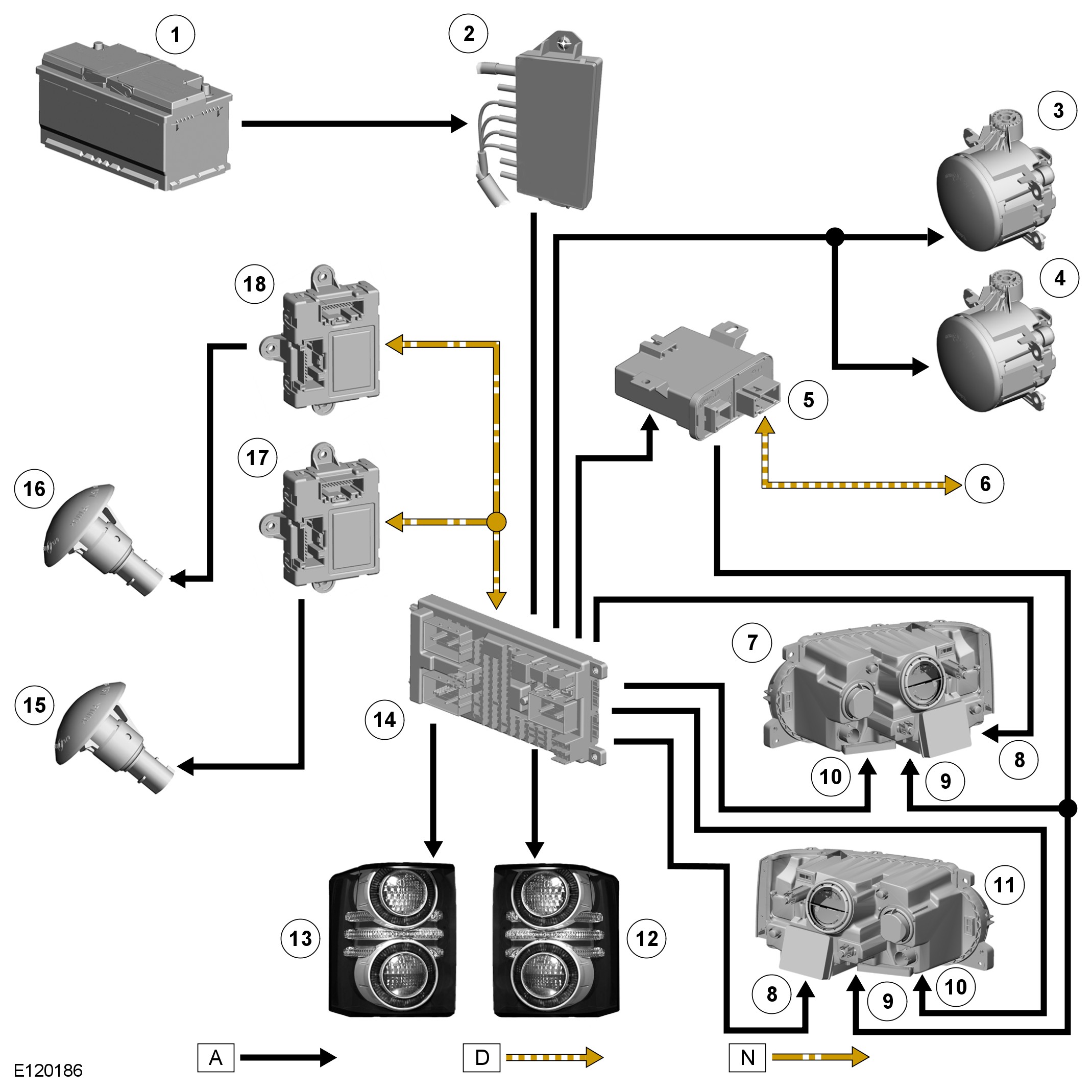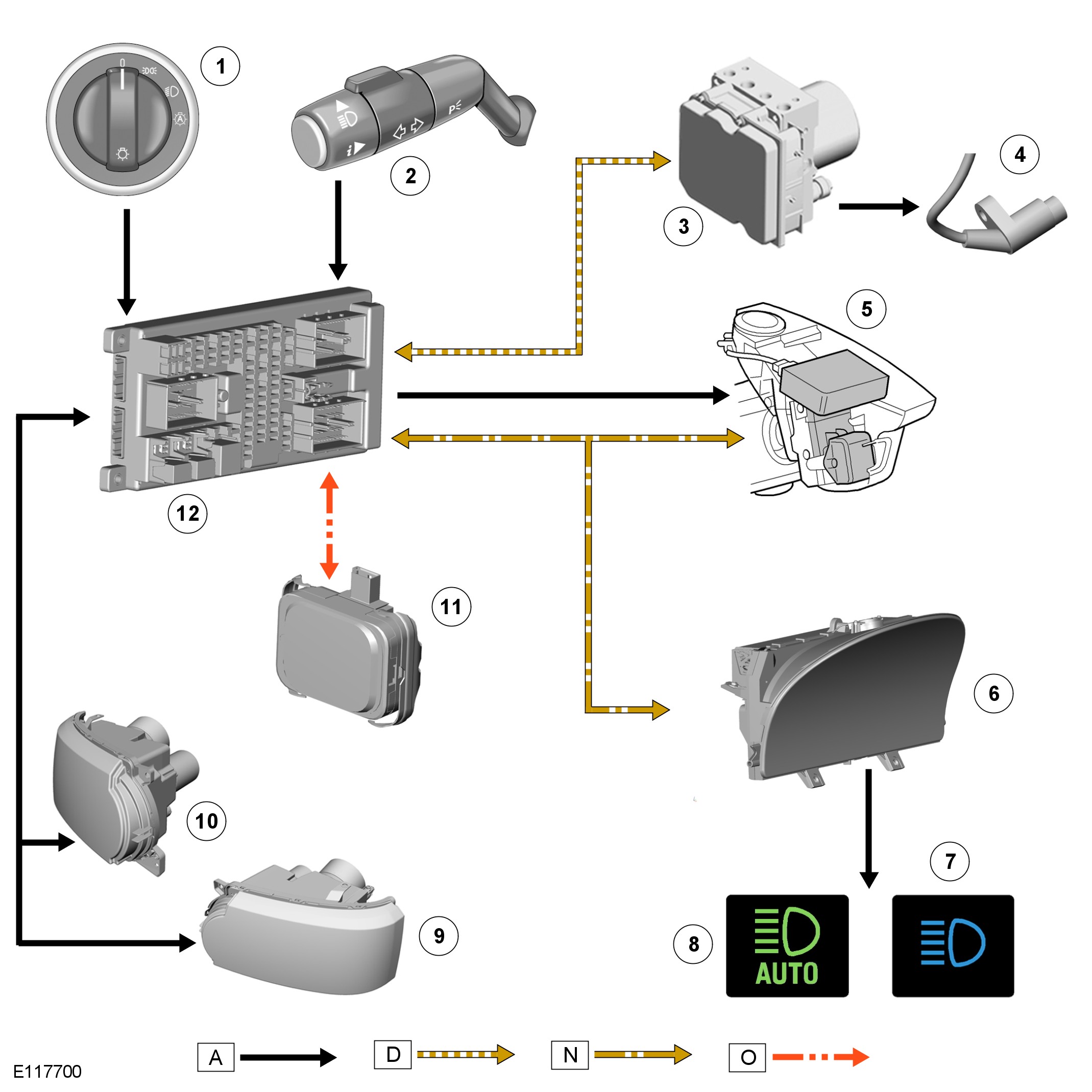 The CJB controls a headlamp delay function which illuminates the driveway after leaving the vehicle. The headlamp delay will operate on low beam headlamps only regardless of the position of the left hand steering column multifunction switch.