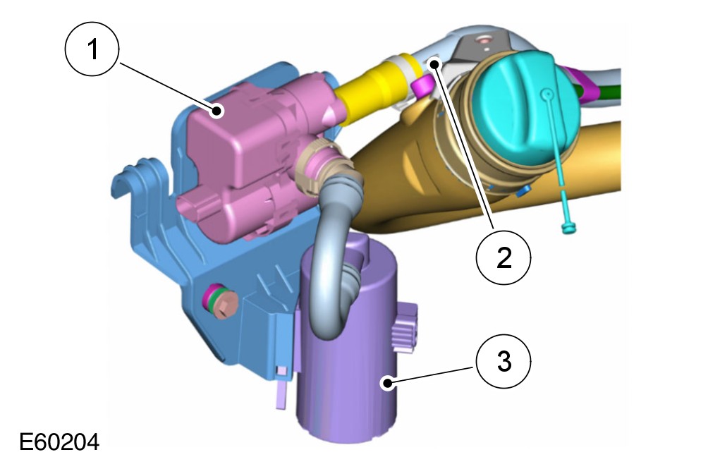 The DMTL pump is located at the top of the fuel filler pipe, on a bracket near to the filler neck. The pump is connected by a pipe to the atmospheric vent of the charcoal canister and incorporates a PTC (positive temperature coefficient) heating element, a normally open valve and a reference orifice. The DMTL pump is only operated when the ignition is switched off and is controlled by the ECM (engine control module). The ECM (engine control module) also monitors the electric air pump operation and the normally open valve for faults.