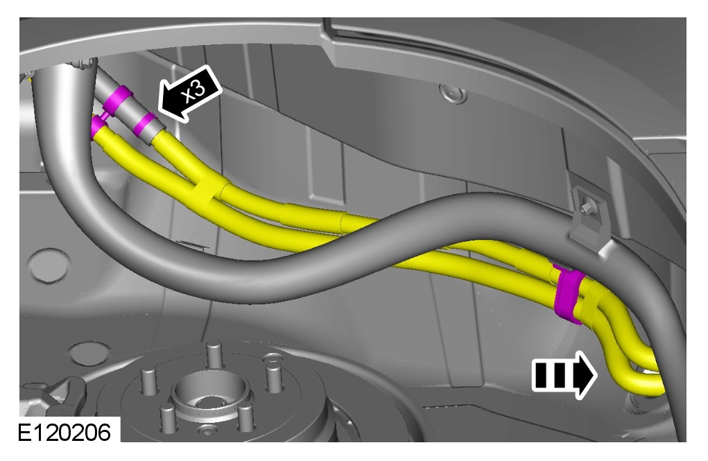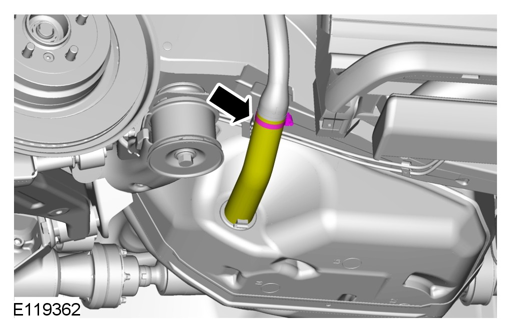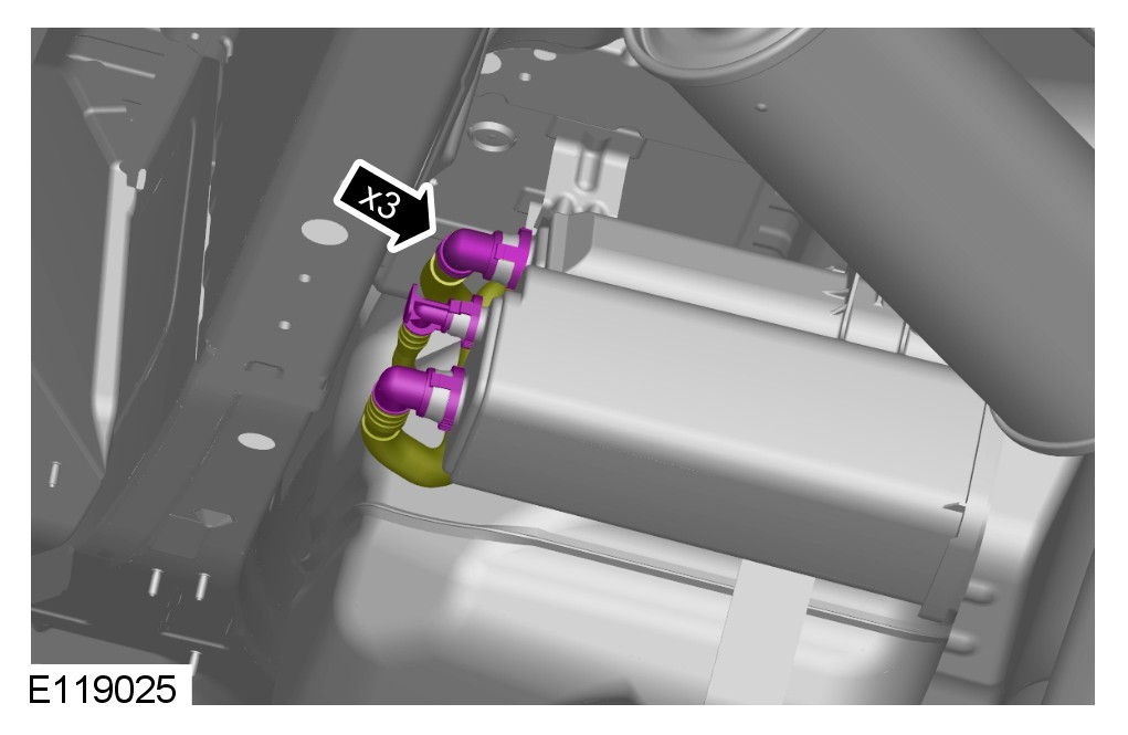CAUTION: Position the breather hose and vent hose through the vehicle body during the fuel tank removal operation.
