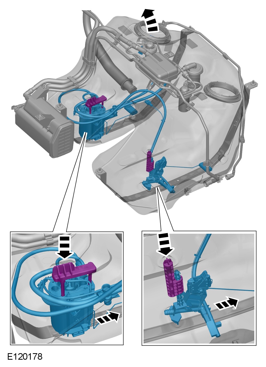 - Depress the clips and release the lower part of the pump and sender unit rearward.
