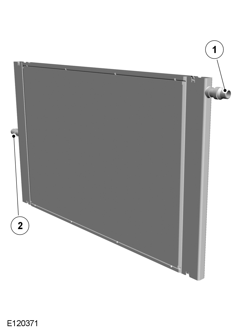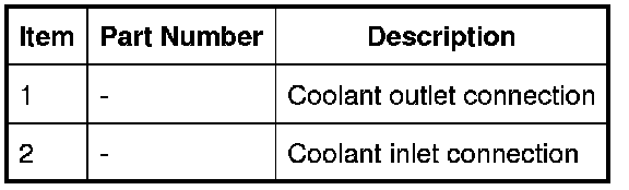 The coolant inlet and outlet connections of the charge air radiator are installed in the RH (right-hand) and LH (left-hand) end tanks respectively. Hoses connect the inlet of the charge air radiator to the charge air coolers, and the outlet to the charge air coolant pump.