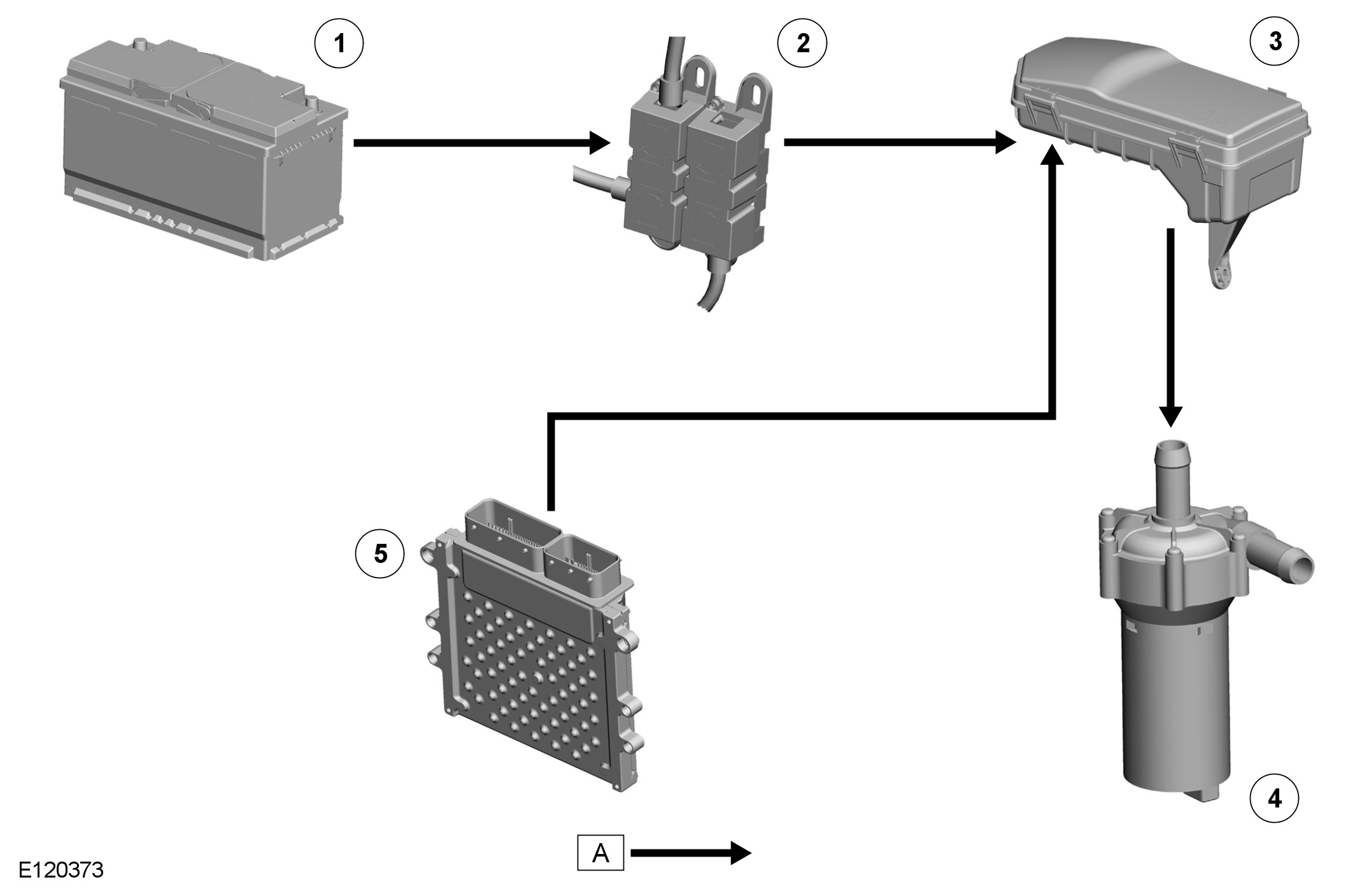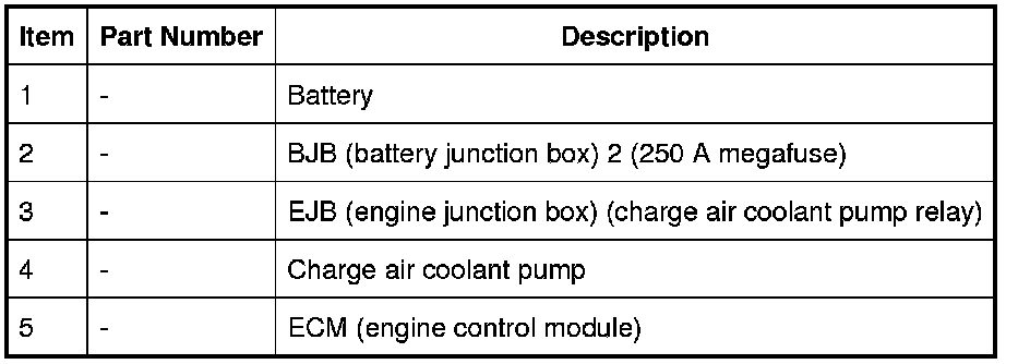 Electrical power for the charge air coolant pump is supplied from the charge air coolant pump relay in the EJB (engine junction box). When the relay is energized, it connects power from the battery, via the BJB (battery junction box) 2 and EJB (engine junction box), to the charge air coolant pump. Operation of the relay is controlled by the ECM (engine control module). The charge air coolant pump relay is energized continuously while the ignition is in power mode 6.