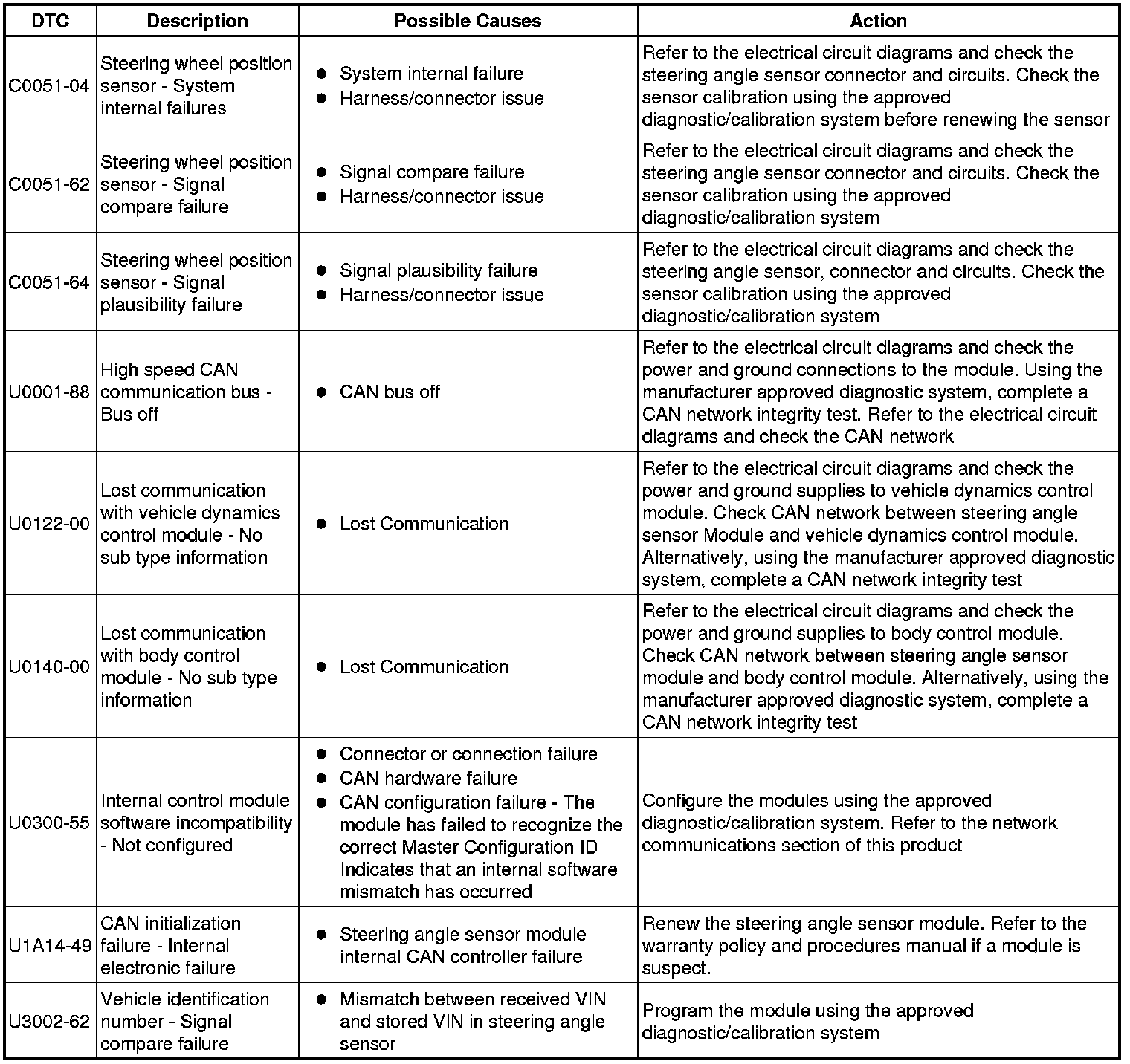 The table below lists all Diagnostic Trouble Codes (DTC's) that could be logged in the Steering Angle Sensor Module, for additional Diagnosis and Testing information refer to the relevant Diagnosis and Testing Section.