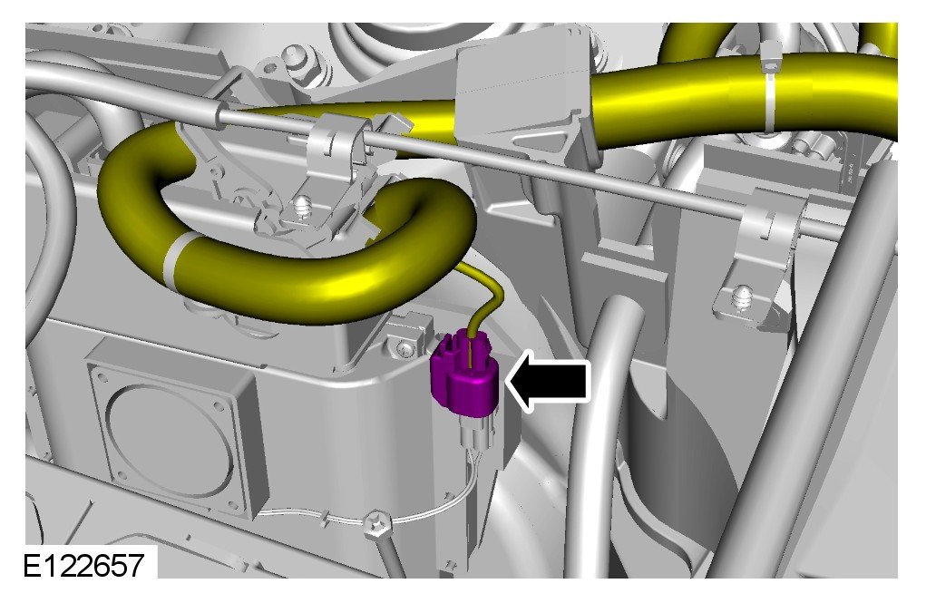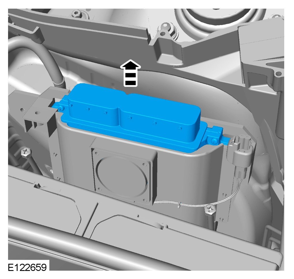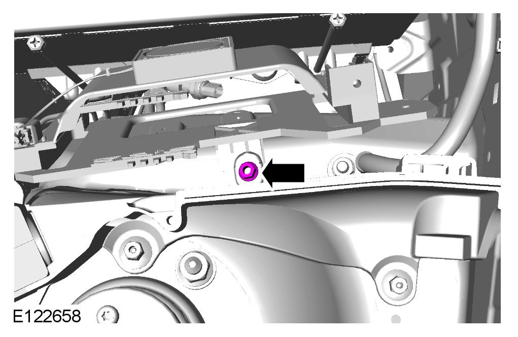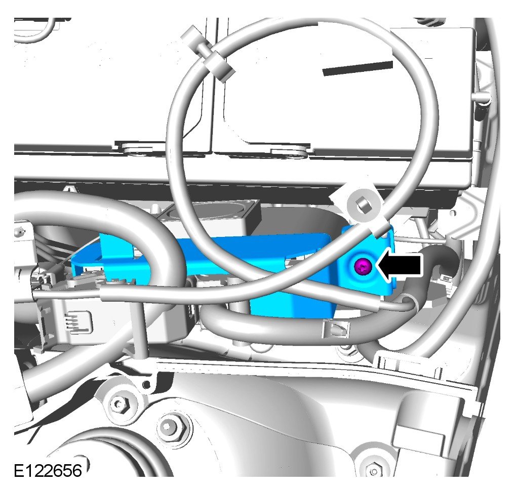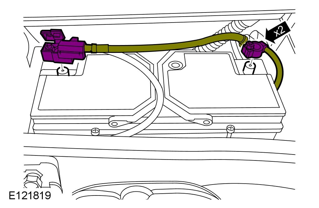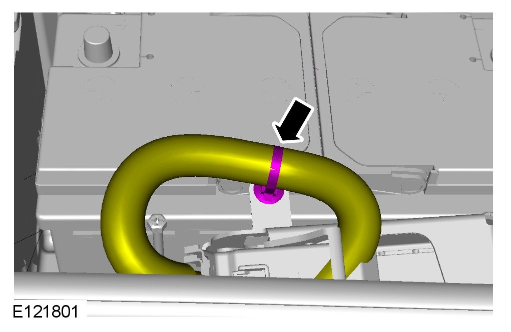 CAUTION: Make sure that the battery monitoring system (BMS) module wiring harness does not get caught beneath the battery securing clamp.