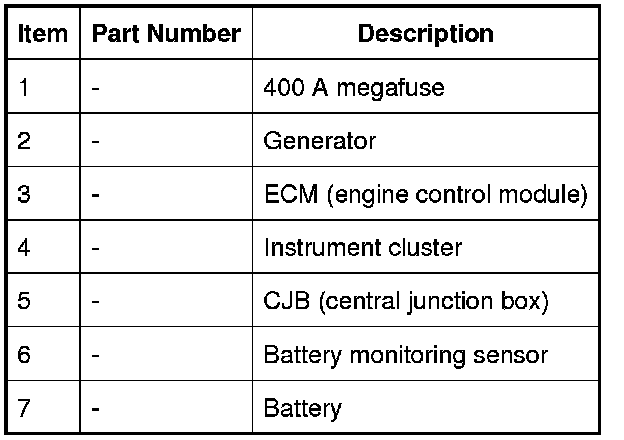 The output voltage required from the generator is calculated by the battery monitoring system. For additional information, refer to Battery, Mounting and Cables (414-01 Battery, Mounting and Cables, Description and Operation).