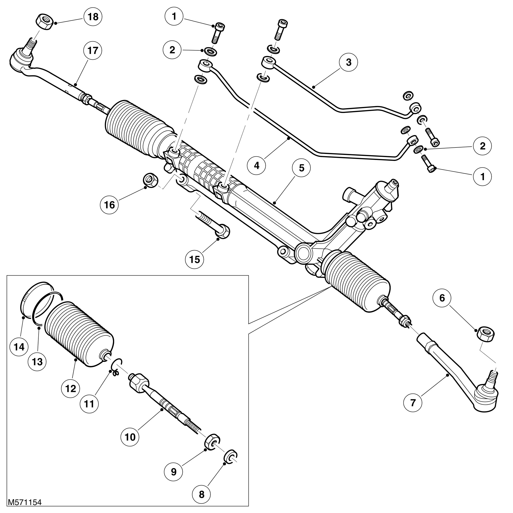 A ZF power steering gear is fitted on the front subframe. The unit is a conventional end take-off rack and pinion power assisted unit with the addition of ZF Servotronic 2 assistance.