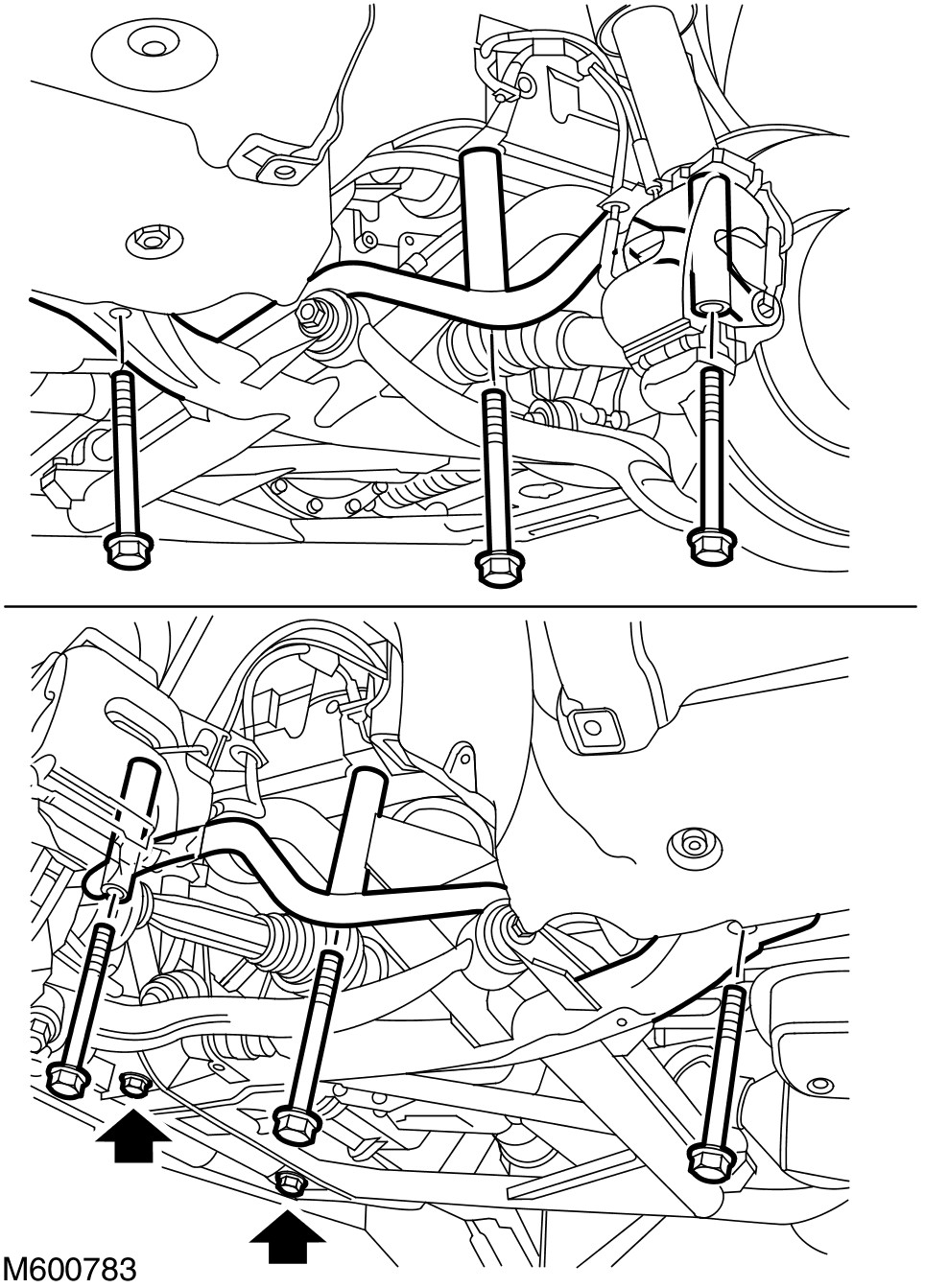 - Tighten the two front subframe bolts to 133 Nm (98 lb.ft).