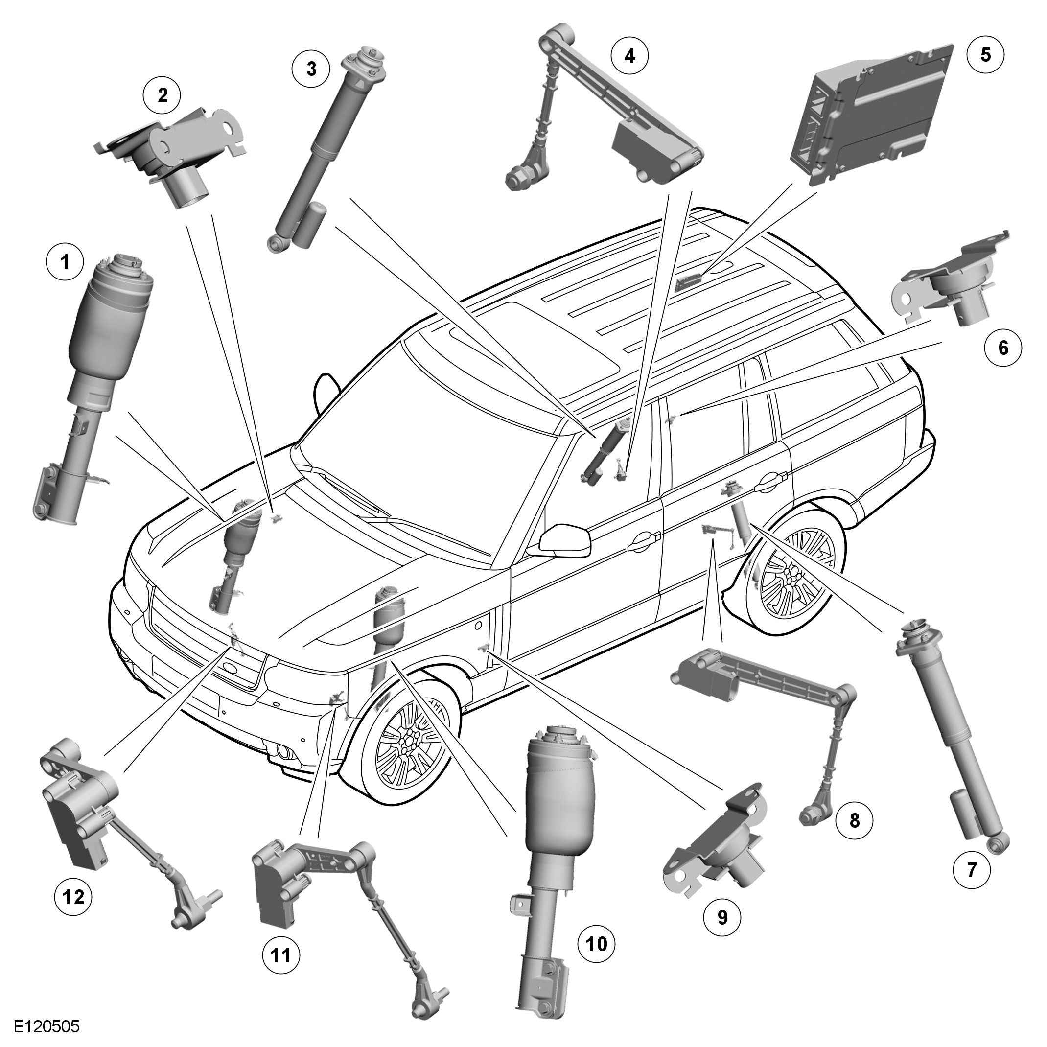 The air suspension system fitted to Range Rover is controlled by the air suspension control module which is located behind the RH (right-hand) rear quarter panel. The control module monitors the height of each corner of the vehicle via four height sensors, which are mounted in-board of each road wheel. The control module also performs an 'on-board diagnostic' function to perform 'health checks' on the system. If faults are detected, codes are stored in the control module and can be retrieved using the Land Rover approved diagnostic system.