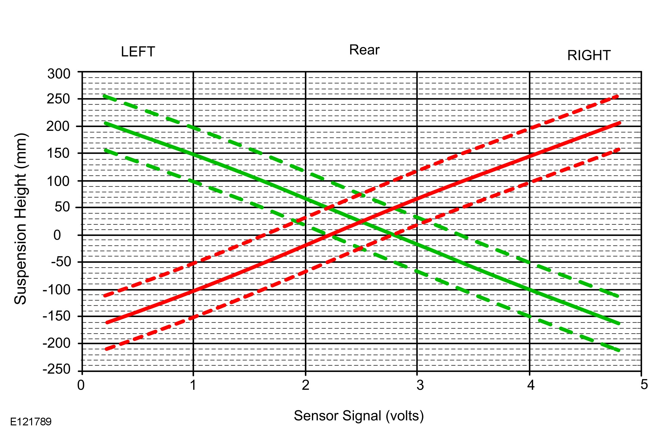 The following graph shows the vehicle height displacement from normal against output voltage for the front height sensors. The center line represents the "nominal" condition but depending on tolerances, the actual line may lie anywhere between the upper and lower lines.