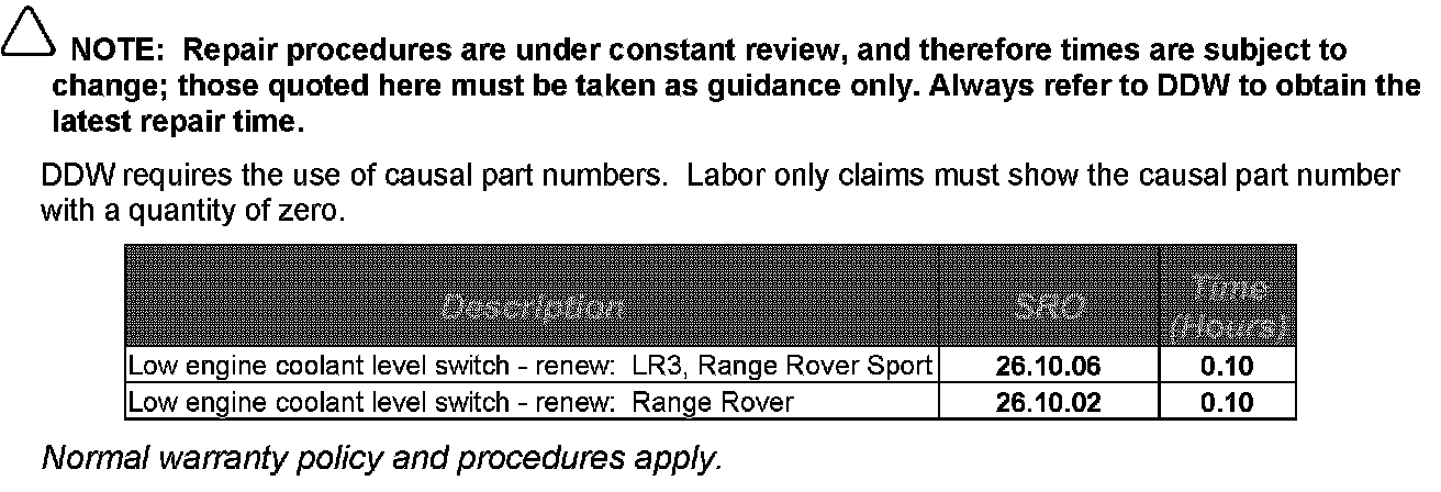 A low engine coolant level switch is now available as a serviceable part. The 'Low Coolant Level' message may be displayed in the instrument pack message center.