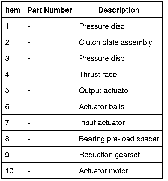 By turning the input actuator disc, via the motor shaft, the output actuator is rotated. This movement acts on 5 balls in a ramp mechanism between the input and output actuators and gives a defined axial movement. The movement forces the pressure disc to induce friction between the sun gear and differential case via the clutch plates supported by the sun gear and the plates supported by the clutch basket on the differential case. This frictional force inhibits the differential rotation; the differential case and left hand differential side gear are locked together.