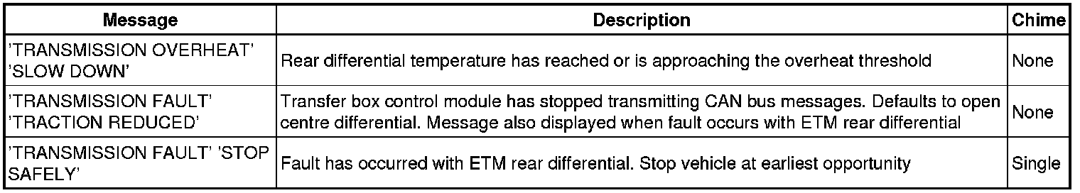The following table shows the messages that can be displayed in the message centre of a high-line instrument cluster relating to the ETM rear differential: