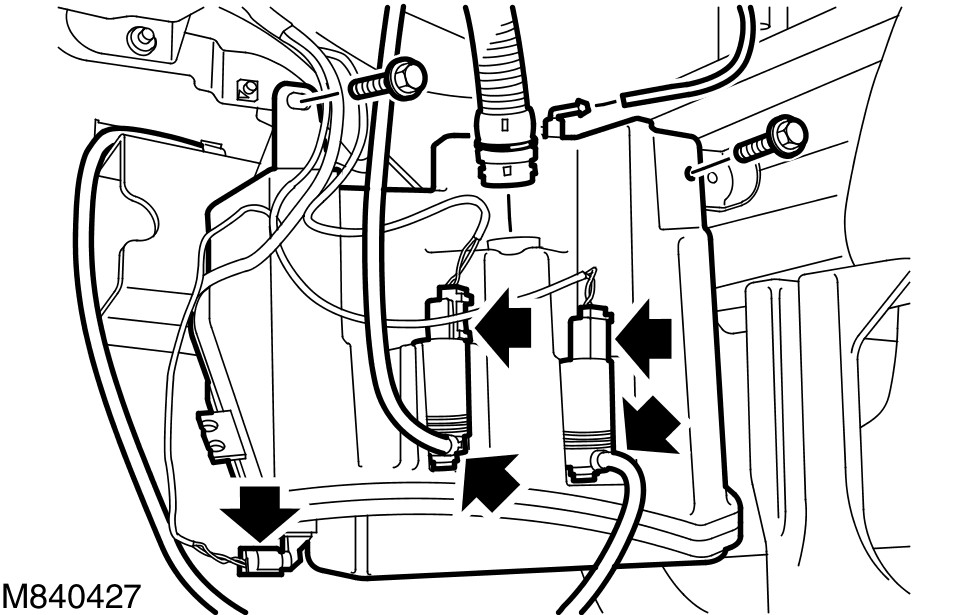 Disconnect the 3 electrical connectors from the windshield washer reservoir pumps.