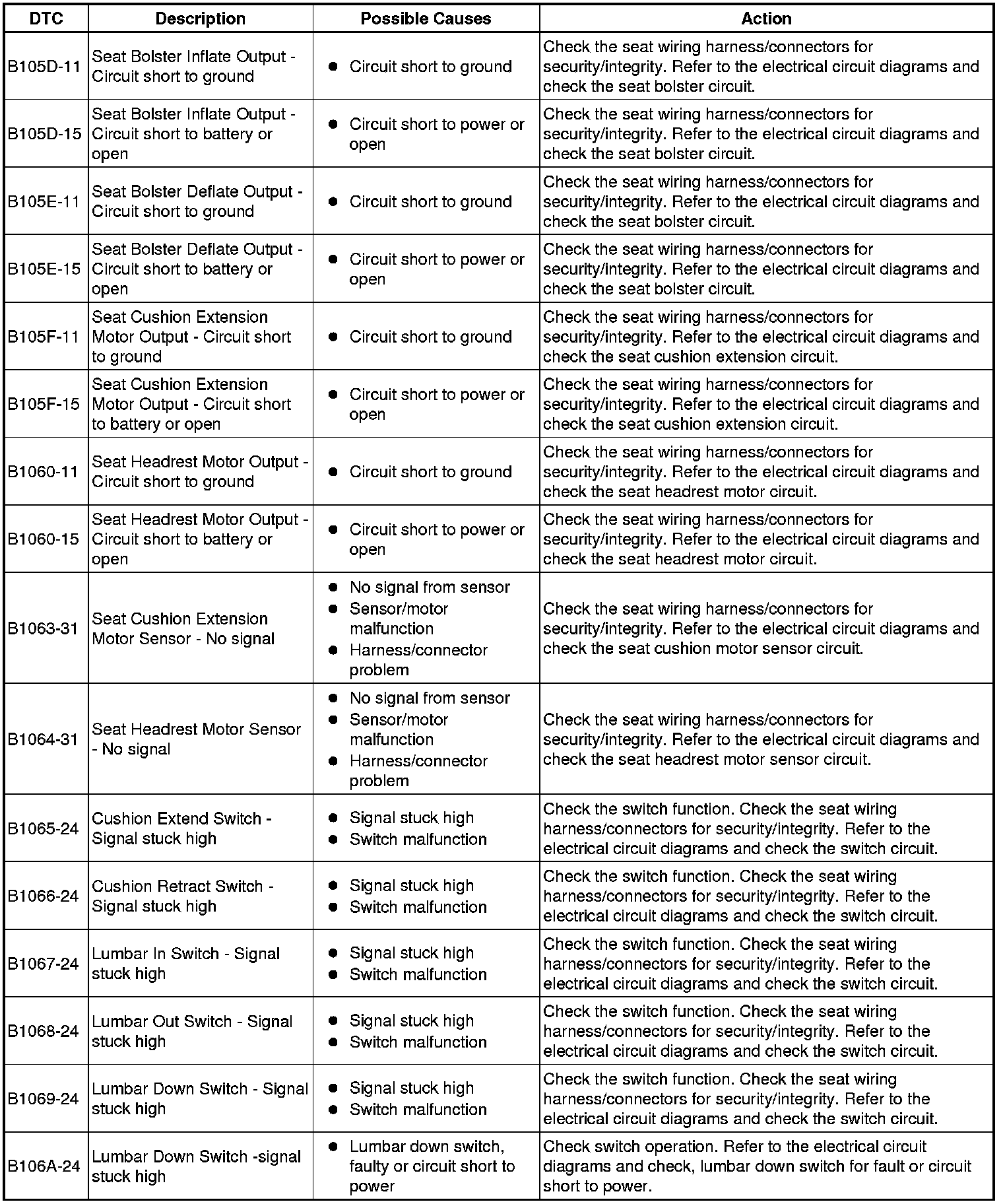 The table below lists all Diagnostic Trouble Codes (DTCs) that could be logged in the Driver Front Seat Module, for additional Diagnosis and Testing information refer to the relevant Diagnosis and Testing Section. For additional information, refer to Seats Initial Inspection and Diagnostic Overview