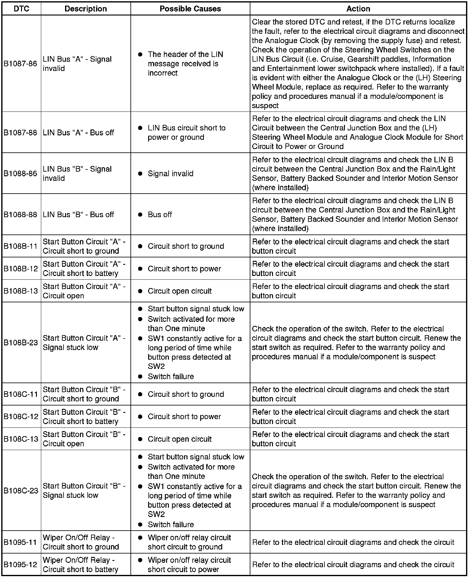 The table below lists all Diagnostic Trouble Codes (DTCs) that could be logged in the Central Junction Box, for additional Diagnosis and Testing information refer to the relevant Diagnosis and Testing Section. For additional information, refer to Communications Network