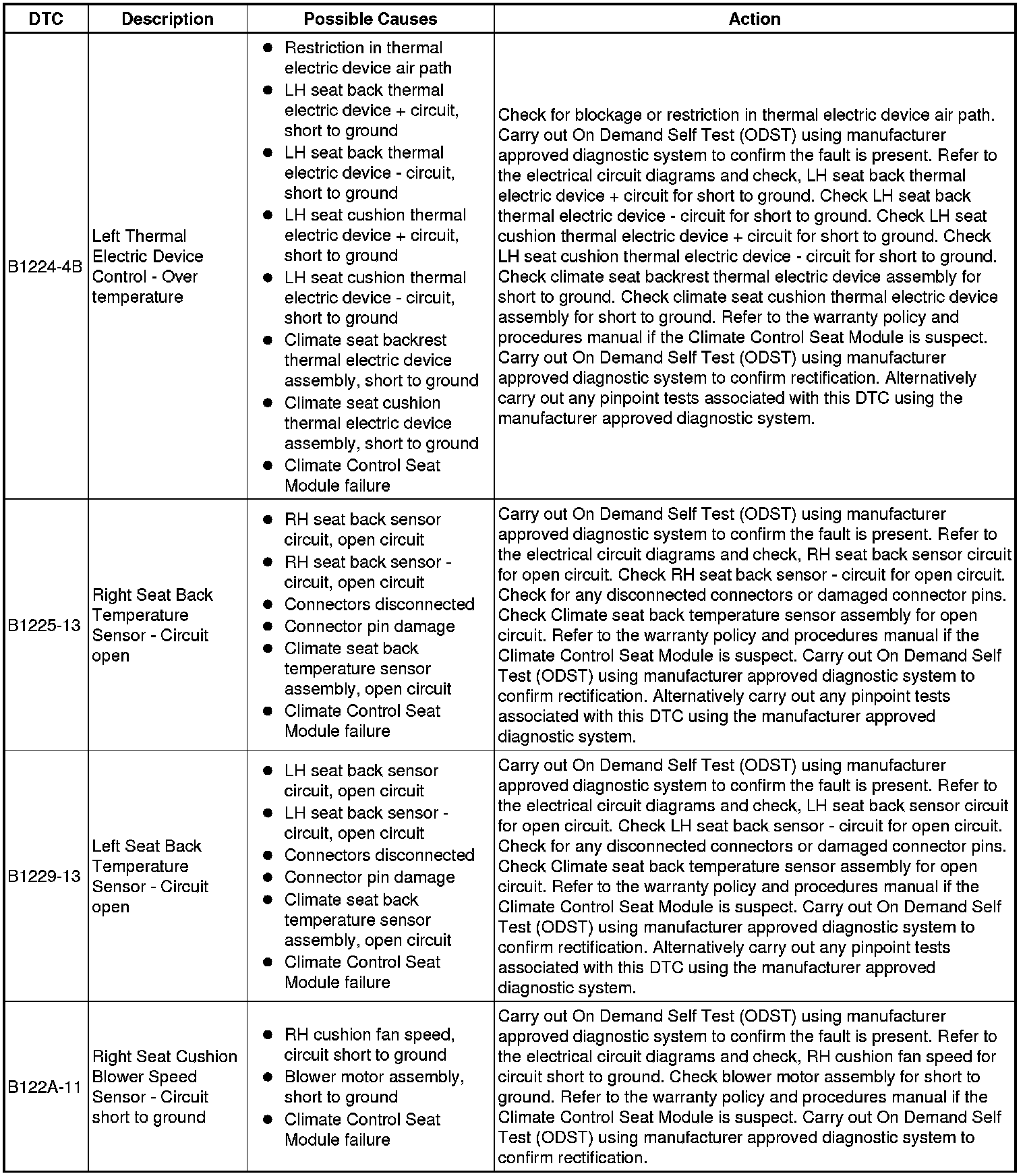The table below lists all Diagnostic Trouble Codes (DTCs) that could be logged in the Climate Controlled Seat Module - Front/Rear (SCME/SCMF), for additional Diagnosis and Testing information refer to the relevant Diagnosis and Testing Section. For additional information, refer to Seats Initial Inspection and Diagnostic Overview
