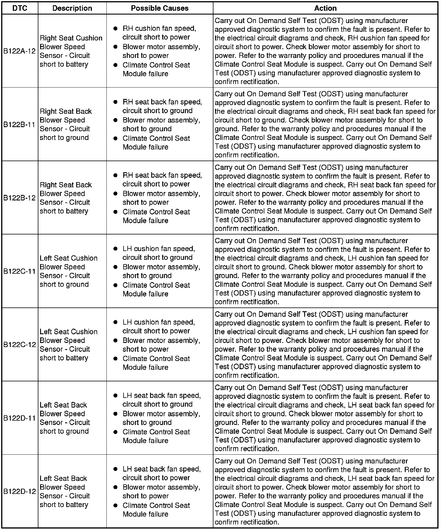 The table below lists all Diagnostic Trouble Codes (DTCs) that could be logged in the Climate Controlled Seat Module - Front/Rear (SCME/SCMF), for additional Diagnosis and Testing information refer to the relevant Diagnosis and Testing Section. For additional information, refer to Seats Initial Inspection and Diagnostic Overview