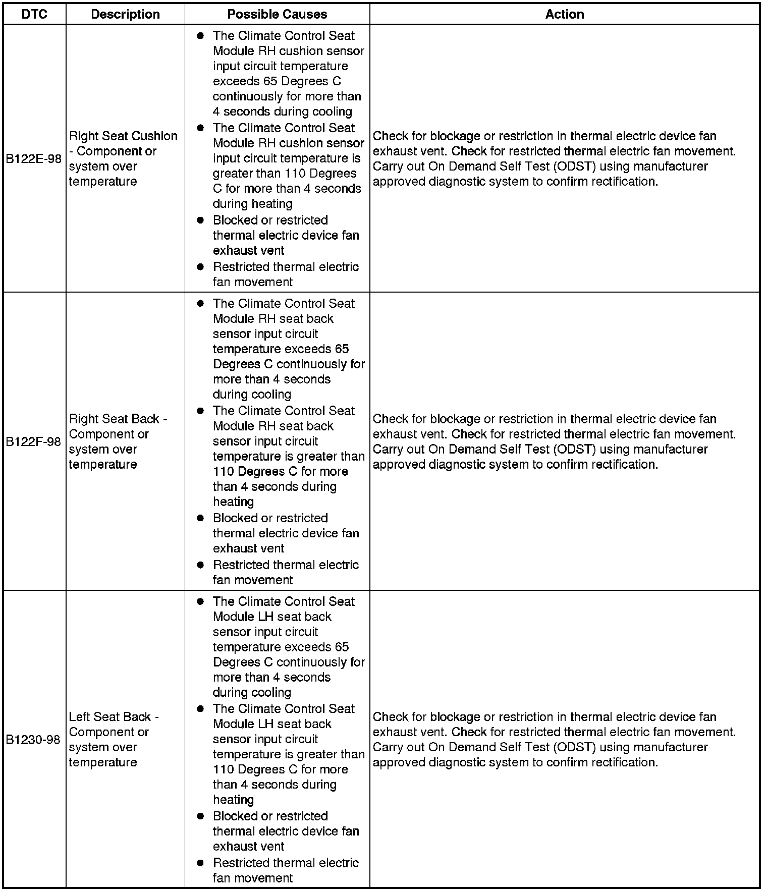 The table below lists all Diagnostic Trouble Codes (DTCs) that could be logged in the Climate Controlled Seat Module - Front/Rear (SCME/SCMF), for additional Diagnosis and Testing information refer to the relevant Diagnosis and Testing Section. For additional information, refer to Seats Initial Inspection and Diagnostic Overview