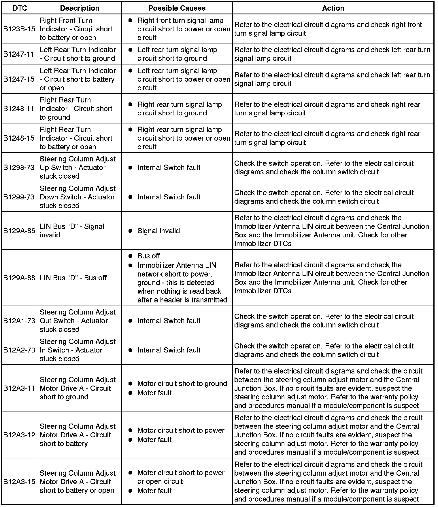 The table below lists all Diagnostic Trouble Codes (DTCs) that could be logged in the Central Junction Box, for additional Diagnosis and Testing information refer to the relevant Diagnosis and Testing Section. For additional information, refer to Communications Network