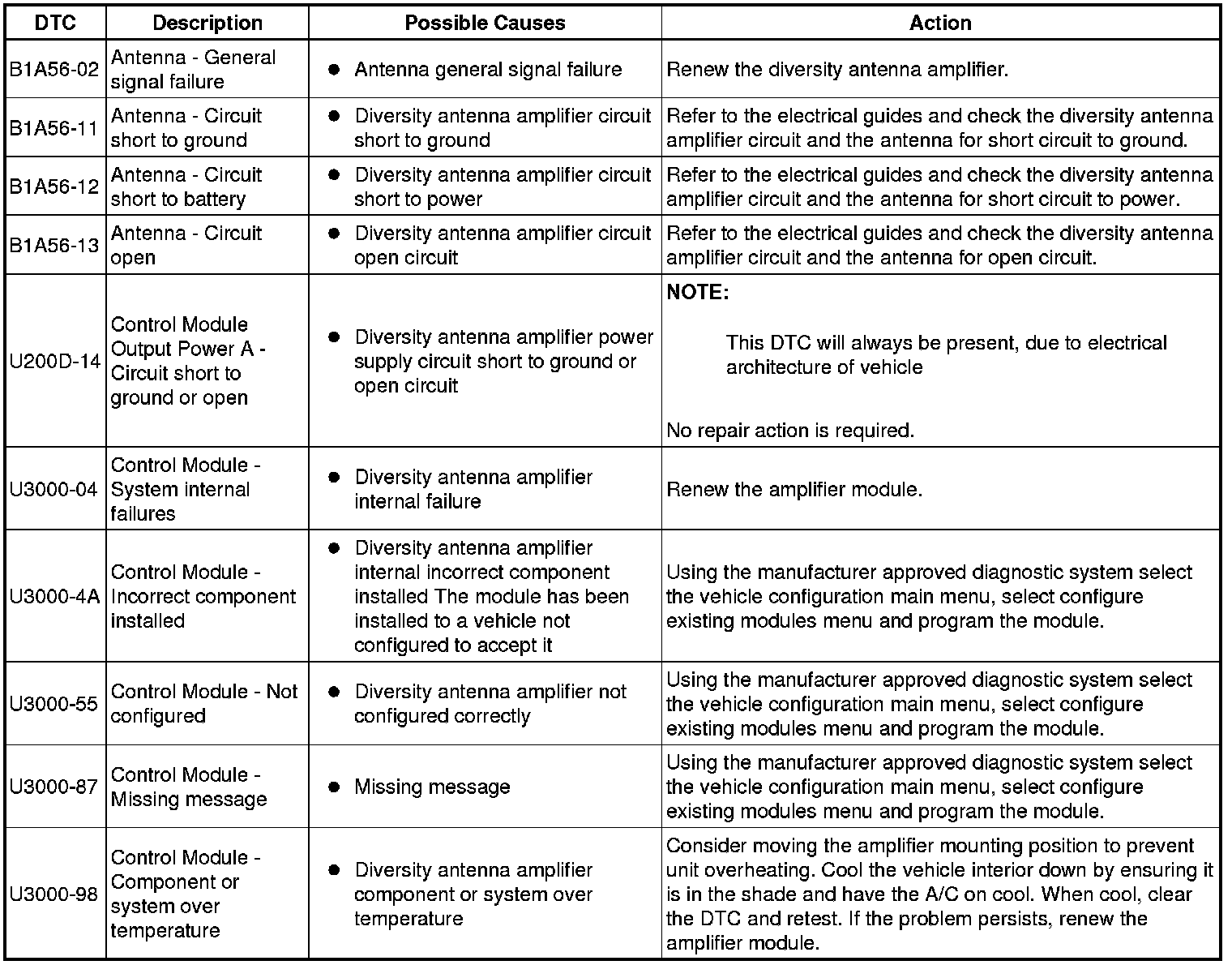 The table below lists all Diagnostic Trouble Codes (DTCs) that could be logged in the Digital Audio Control Module C, for additional Diagnosis and Testing information refer to the relevant Diagnosis and Testing Section. For additional information, refer to Information and Entertainment System Initial Inspection and Diagnostic Overview