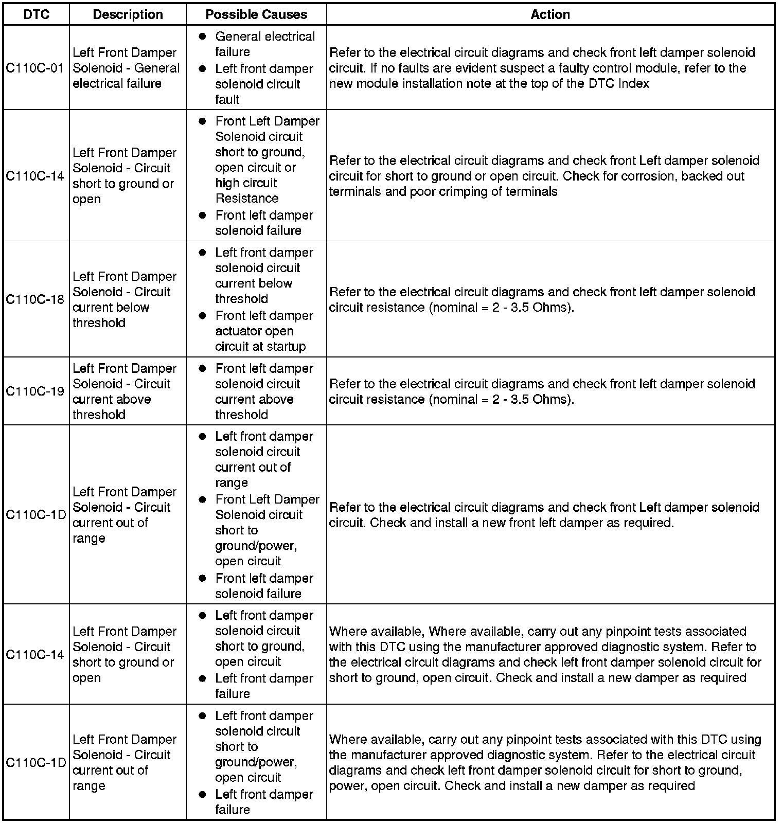 The table below lists all Diagnostic Trouble Codes (DTCs) that could be logged in the Adaptive Damping Control Module, for additional Diagnosis and Testing information refer to the relevant Diagnosis and Testing Section.