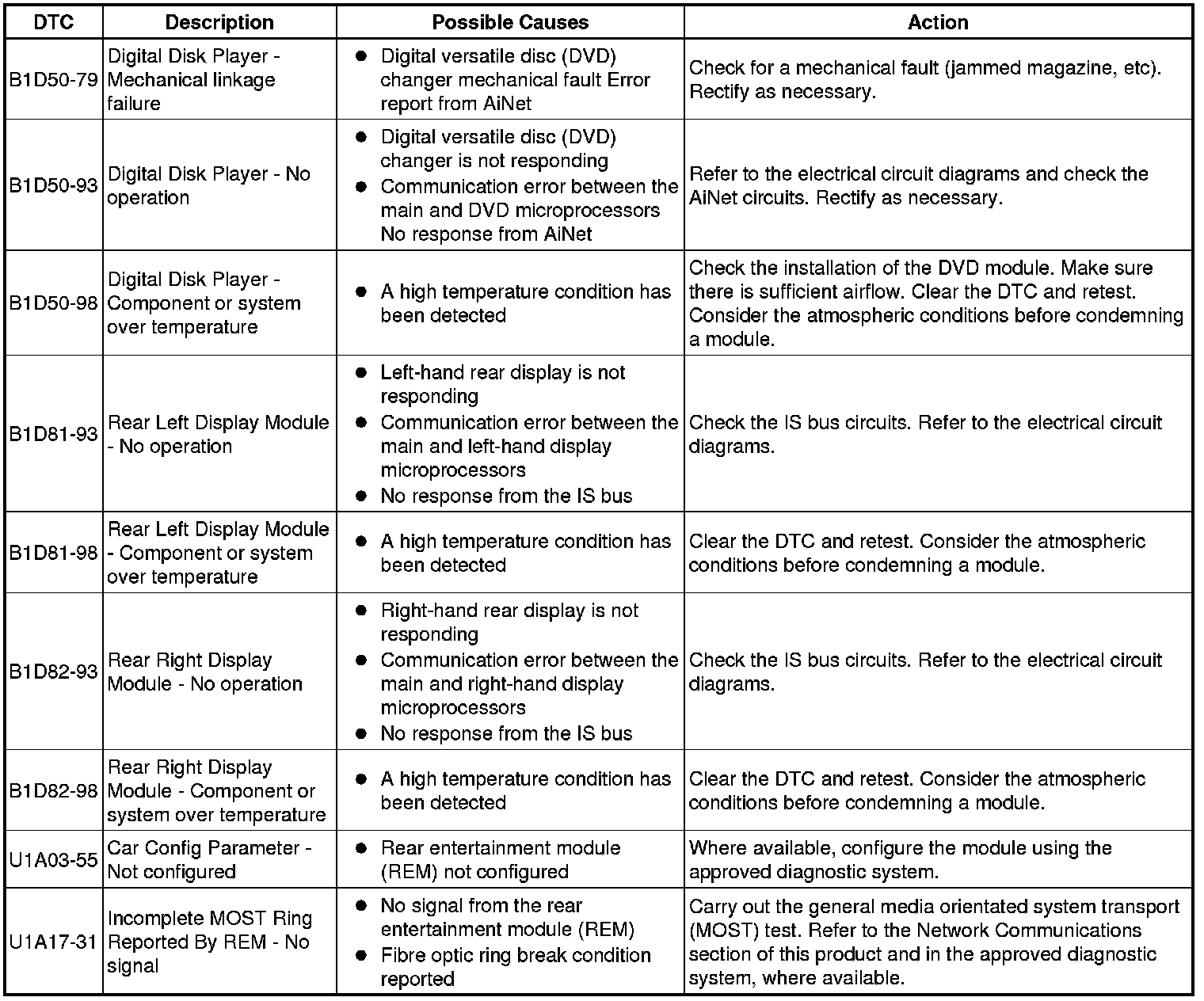 The table below lists all Diagnostic Trouble Codes (DTCs) that could be logged in the Rear Entertainment Control Module, for additional Diagnosis and Testing information refer to the relevant Diagnosis and Testing Section. For additional information, refer to Information and Entertainment System Initial Inspection and Diagnostic Overview