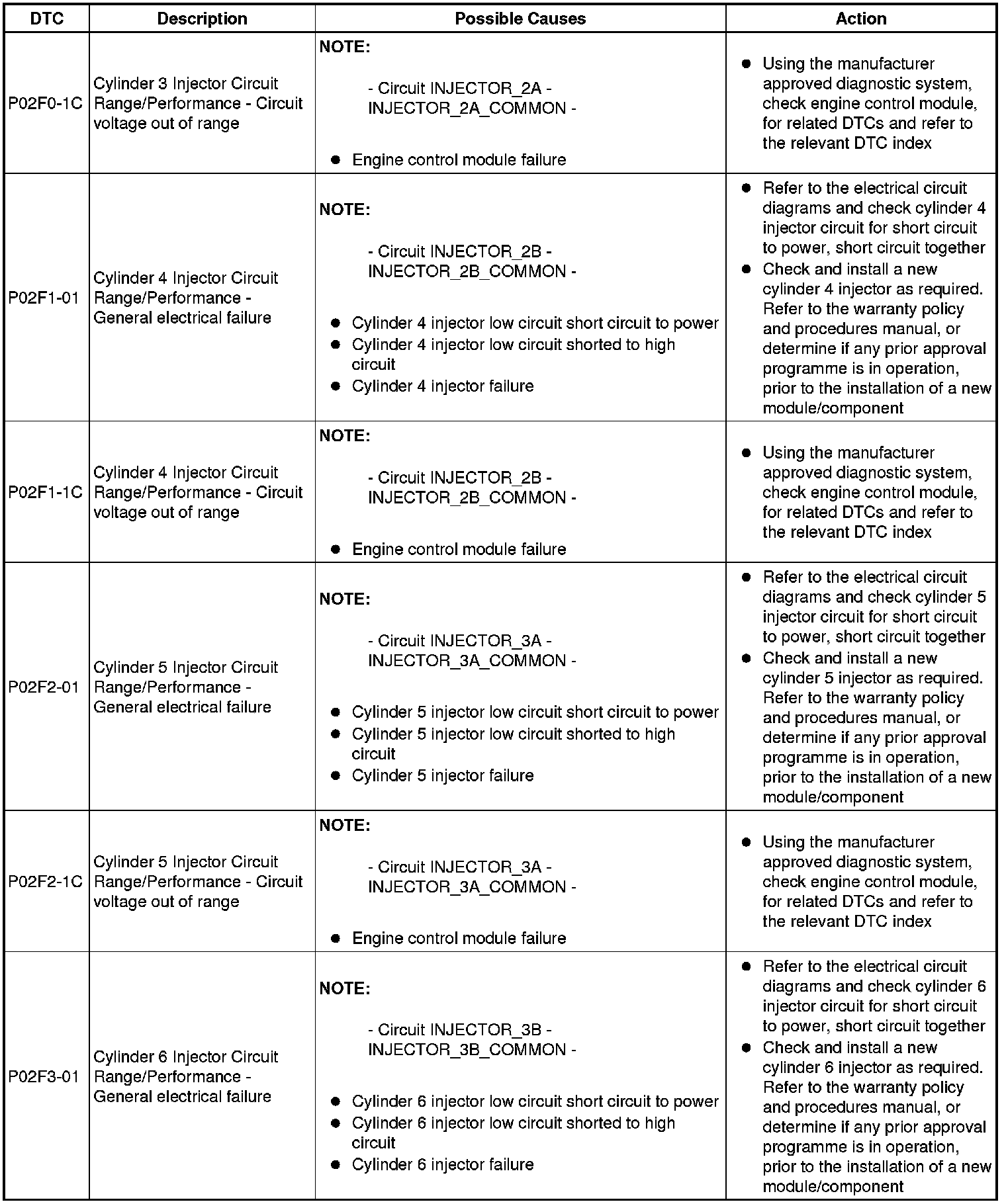 The table below lists all Diagnostic Trouble Codes (DTCs) that could be logged in the Engine Control Module, for additional Diagnosis and Testing information refer to the relevant Diagnosis and Testing Section. For additional information, refer to Electronic Engine Controls