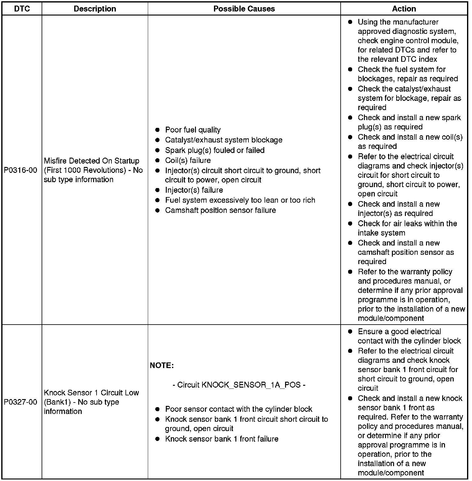The table below lists all Diagnostic Trouble Codes (DTCs) that could be logged in the Engine Control Module, for additional Diagnosis and Testing information refer to the relevant Diagnosis and Testing Section. For additional information, refer to Electronic Engine Controls