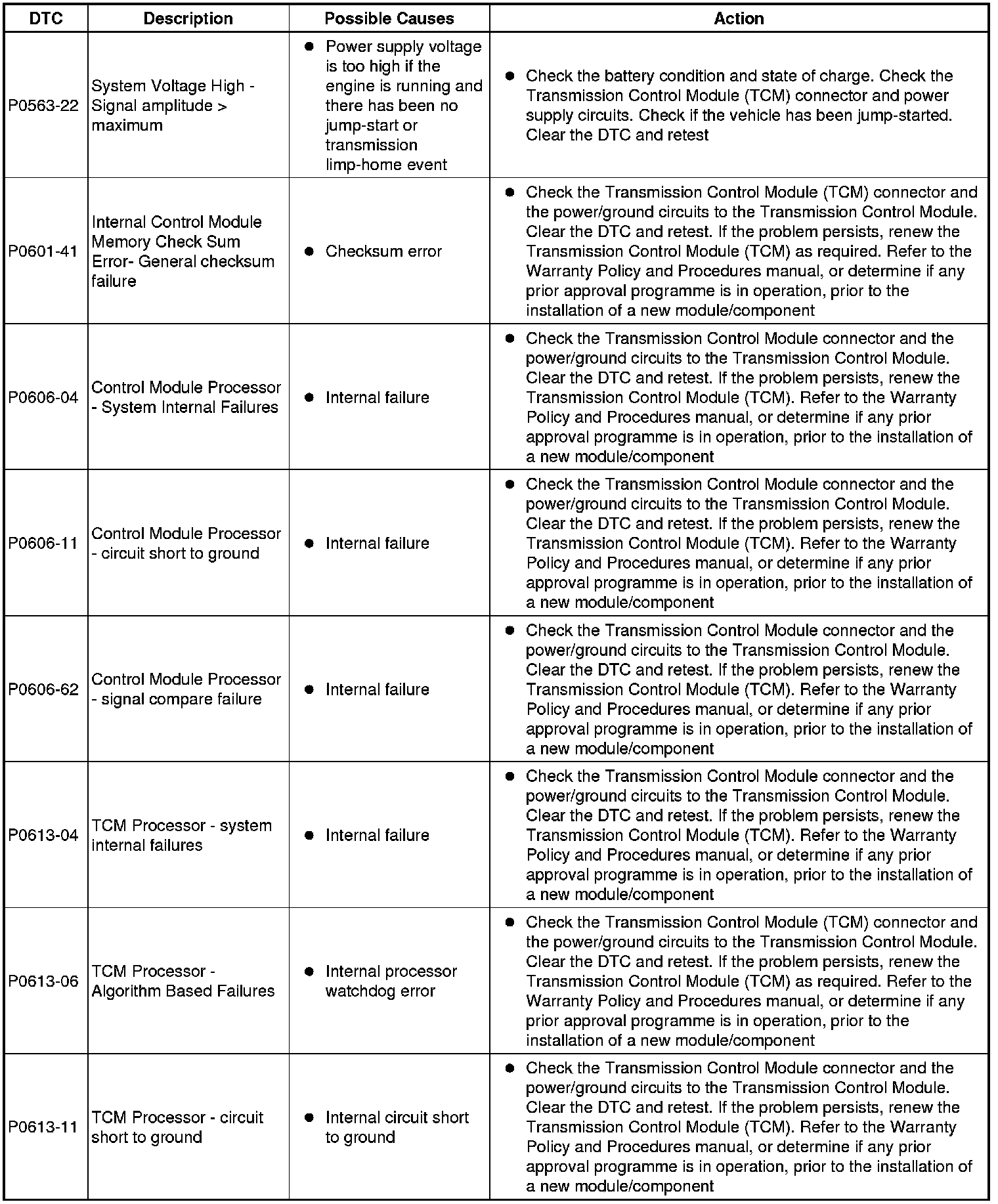 The table below lists all Diagnostic Trouble Codes (DTCs) that could be logged in the Transmission Control Module, for additional Diagnosis and Testing information refer to the relevant Diagnosis and Testing Section. For additional information, refer to Automatic Transmission