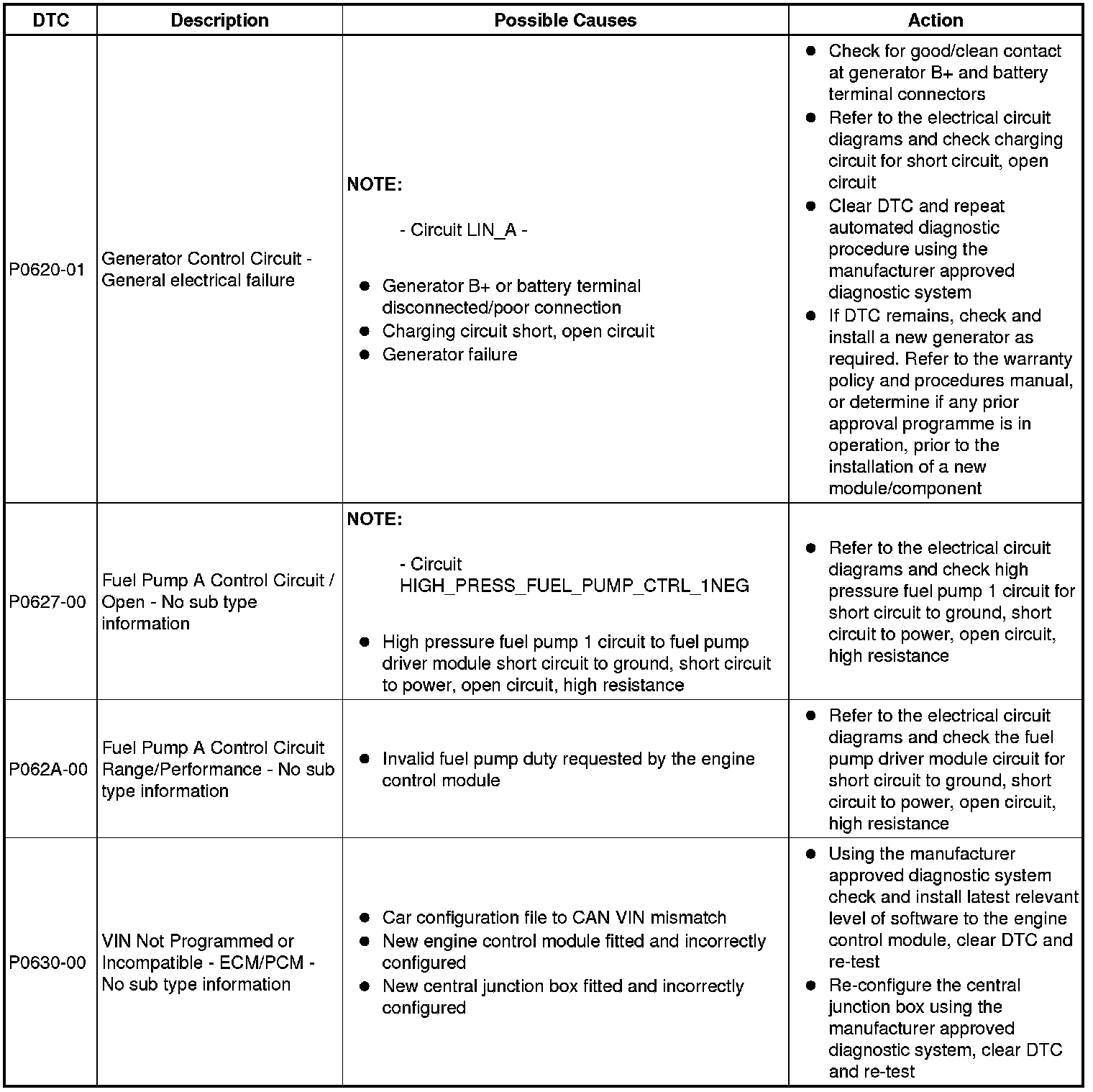 The table below lists all Diagnostic Trouble Codes (DTCs) that could be logged in the Engine Control Module, for additional Diagnosis and Testing information refer to the relevant Diagnosis and Testing Section. For additional information, refer to Electronic Engine Controls