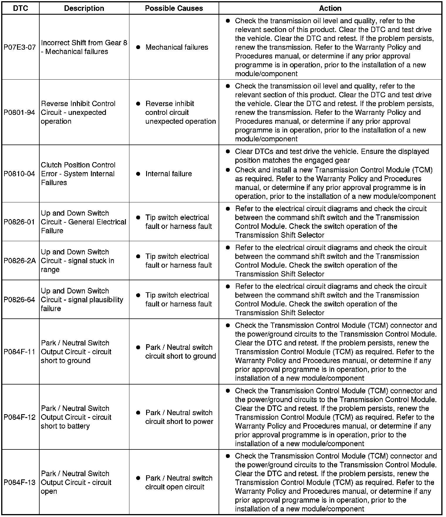 The table below lists all Diagnostic Trouble Codes (DTCs) that could be logged in the Transmission Control Module, for additional Diagnosis and Testing information refer to the relevant Diagnosis and Testing Section. For additional information, refer to Automatic Transmission