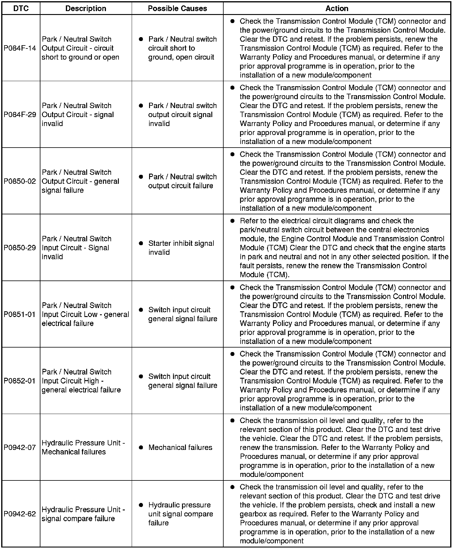 The table below lists all Diagnostic Trouble Codes (DTCs) that could be logged in the Transmission Control Module, for additional Diagnosis and Testing information refer to the relevant Diagnosis and Testing Section. For additional information, refer to Automatic Transmission