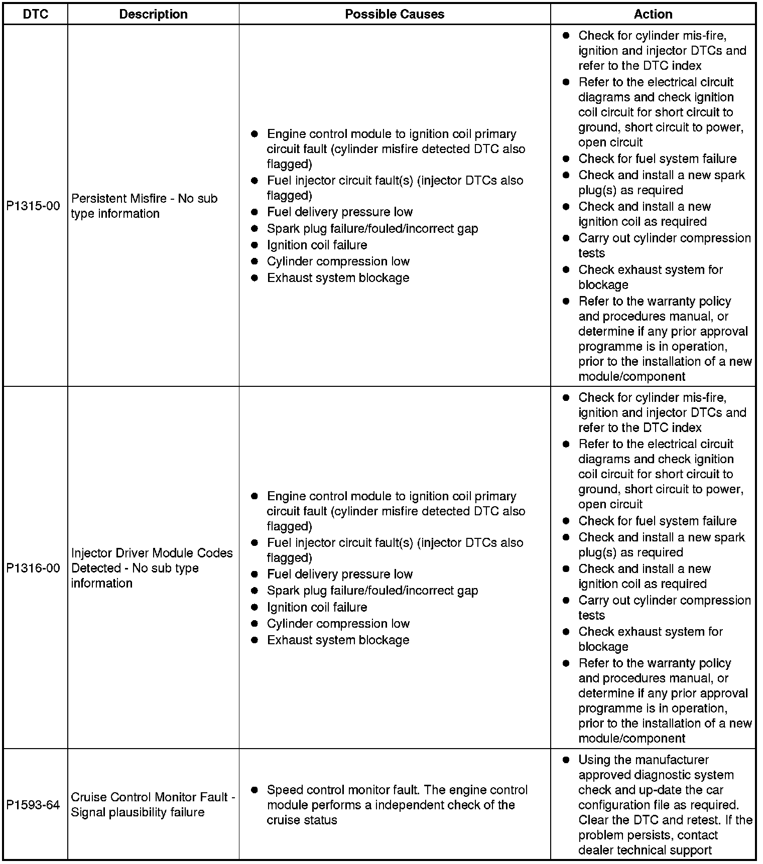 The table below lists all Diagnostic Trouble Codes (DTCs) that could be logged in the Engine Control Module, for additional Diagnosis and Testing information refer to the relevant Diagnosis and Testing Section. For additional information, refer to Electronic Engine Controls