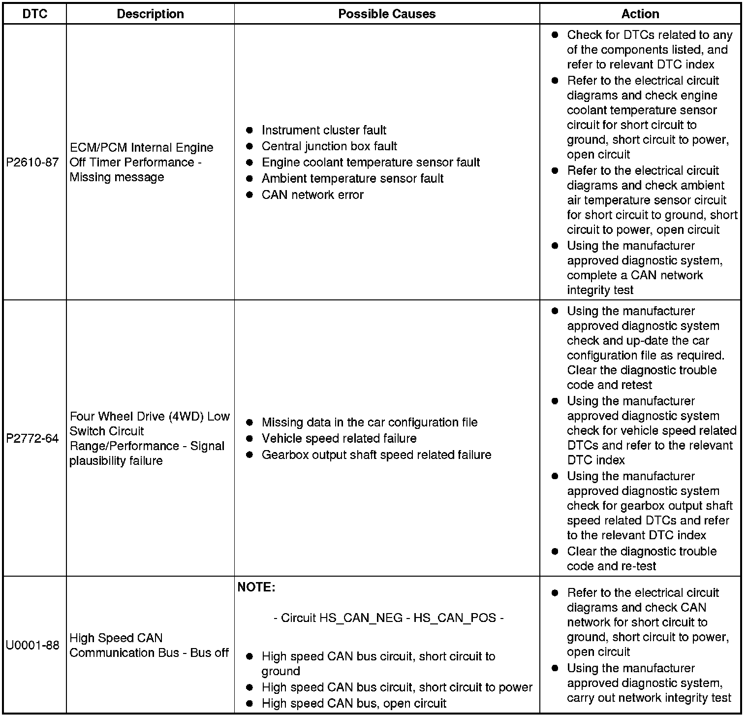 The table below lists all Diagnostic Trouble Codes (DTCs) that could be logged in the Engine Control Module, for additional Diagnosis and Testing information refer to the relevant Diagnosis and Testing Section. For additional information, refer to Electronic Engine Controls
