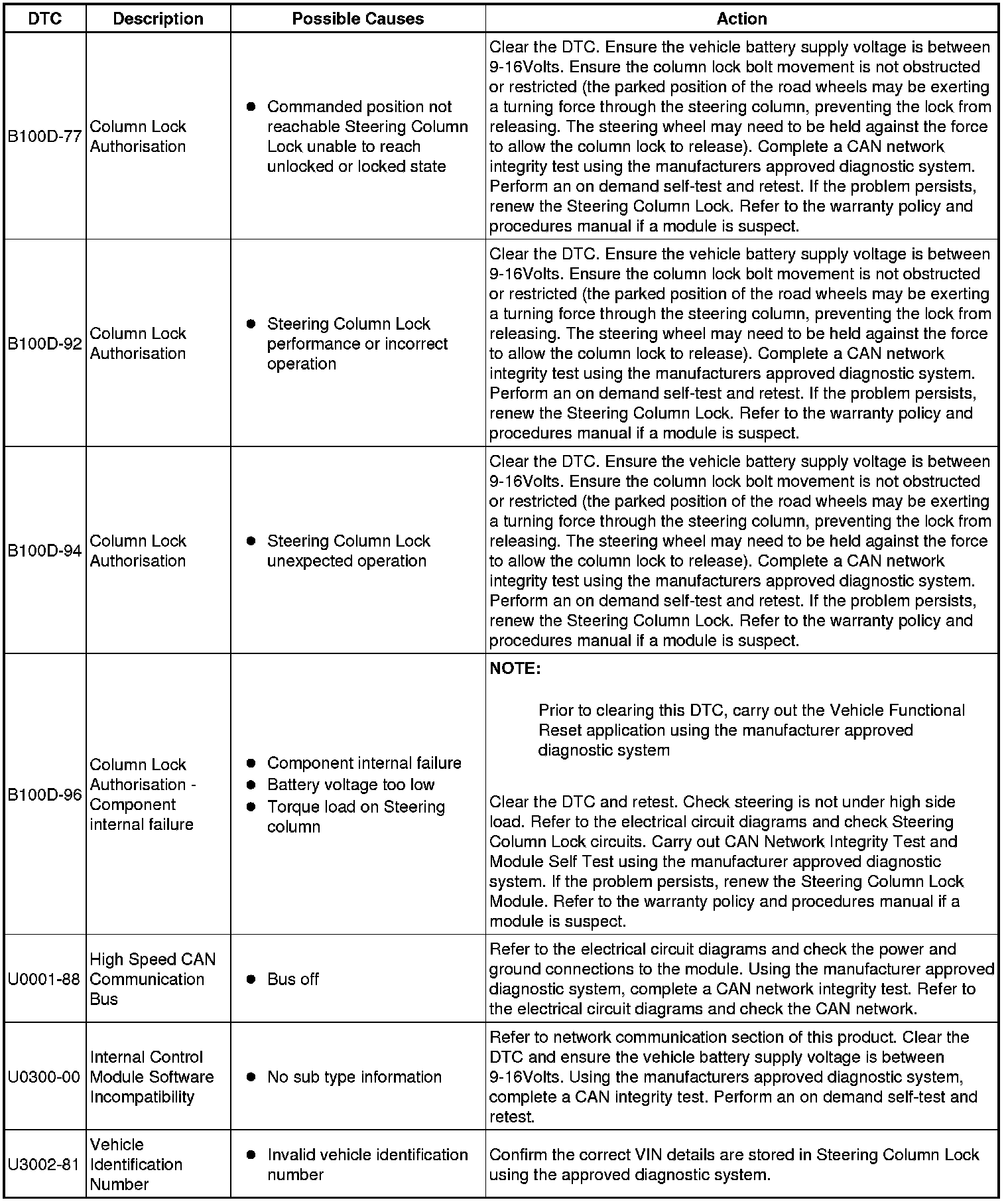 The table below lists all Diagnostic Trouble Codes (DTCs) that could be logged in the Steering Column Lock Module, for additional Diagnosis and Testing information refer to the relevant Diagnosis and Testing Section.