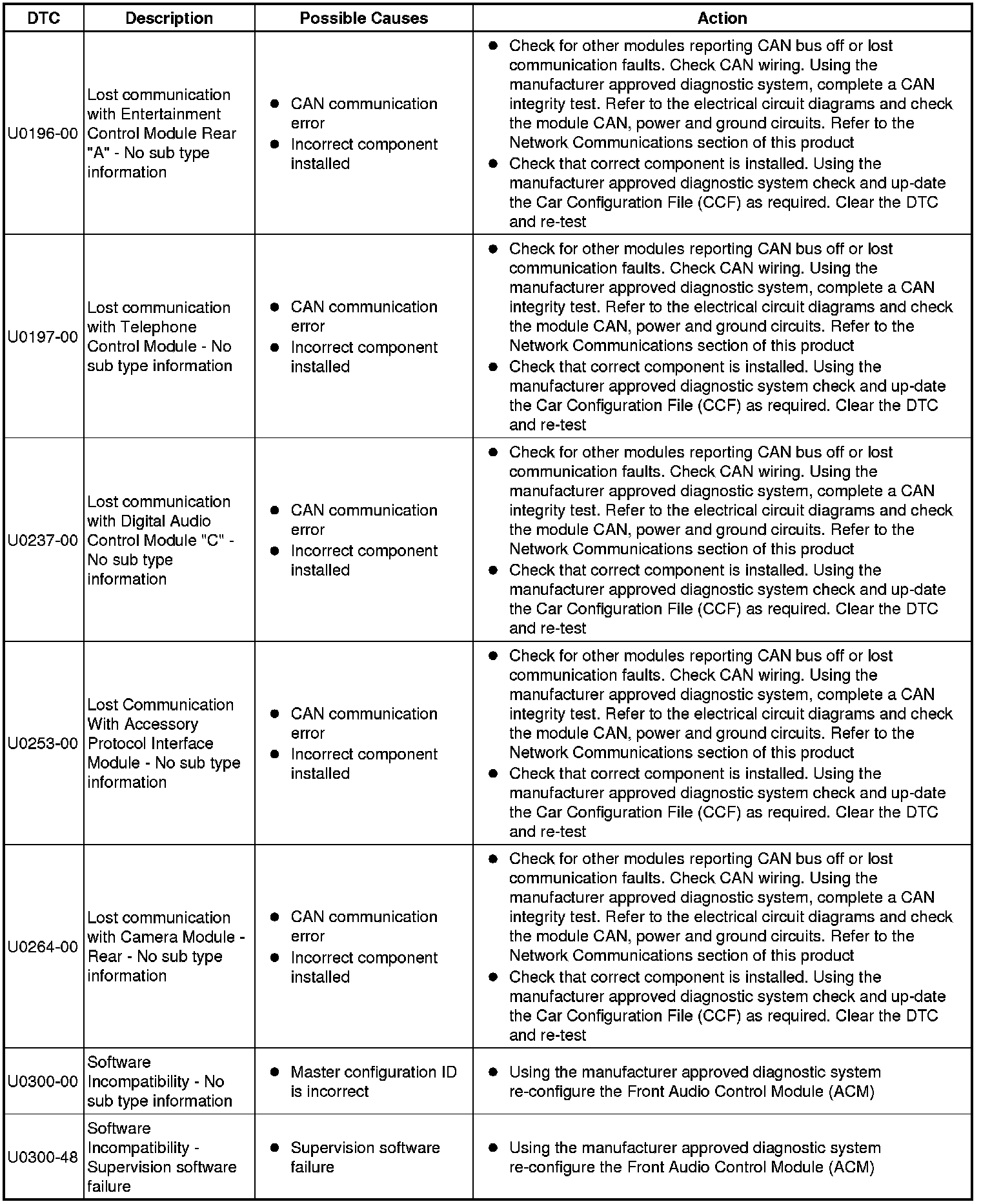 The table below lists all Diagnostic Trouble Codes (DTCs) that could be logged in the Audio Front Control module, for additional Diagnosis and Testing information refer to the relevant Diagnosis and Testing Section. For additional information, refer to Information and Entertainment System Initial Inspection and Diagnostic Overview