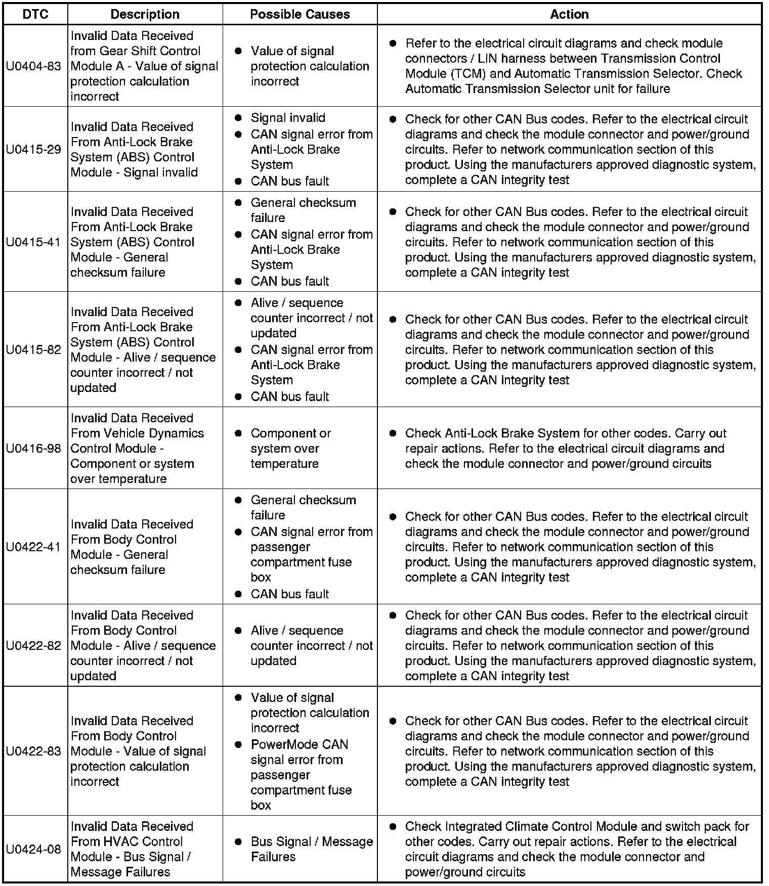 The table below lists all Diagnostic Trouble Codes (DTCs) that could be logged in the Transmission Control Module, for additional Diagnosis and Testing information refer to the relevant Diagnosis and Testing Section. For additional information, refer to Automatic Transmission