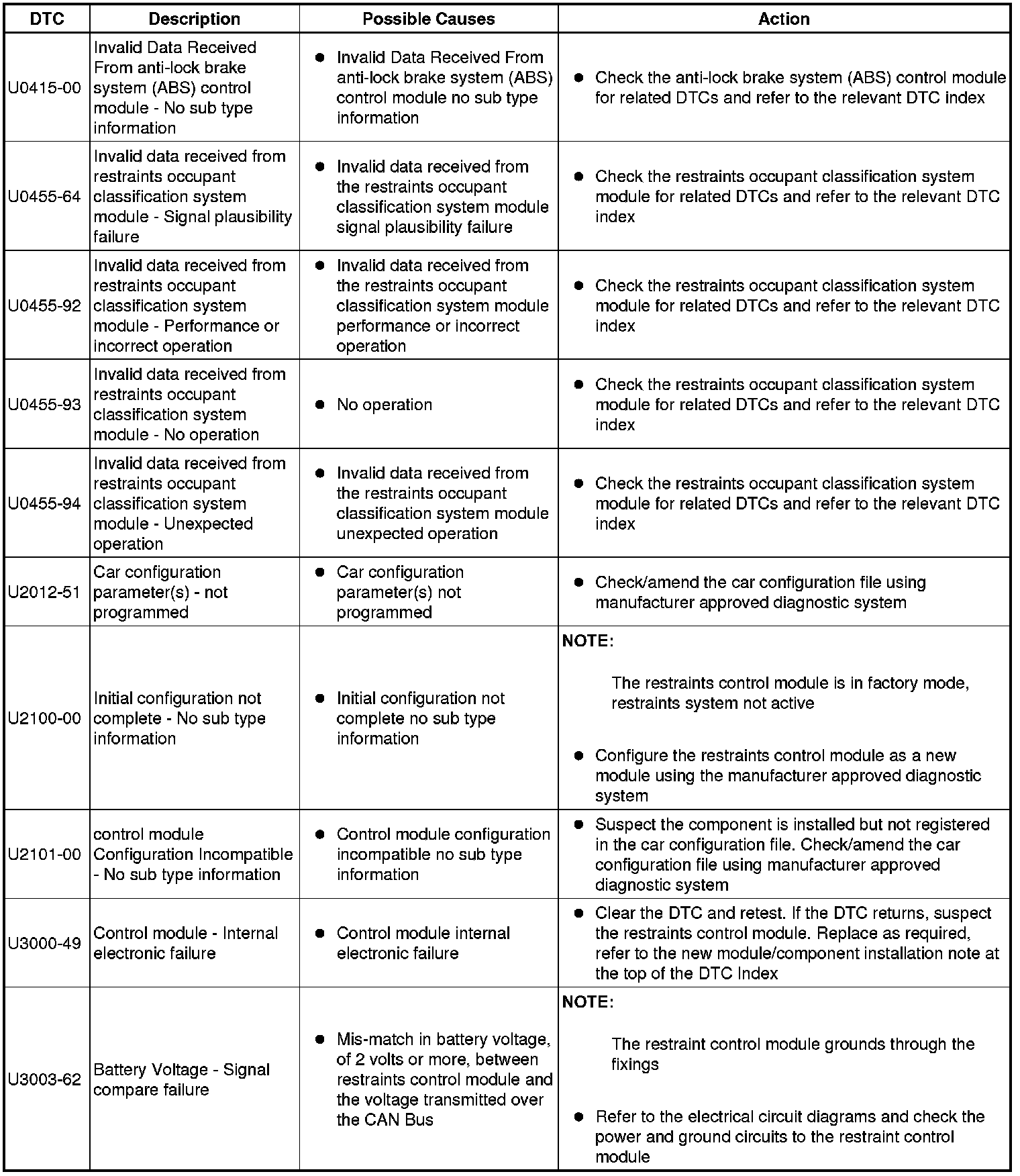 The table below lists all Diagnostic Trouble Codes (DTCs) that could be logged in the Restraints Control Module, for additional Diagnosis and Testing information refer to the relevant Diagnosis and Testing Section. For additional information, refer to Air Bag Systems Description and Operation