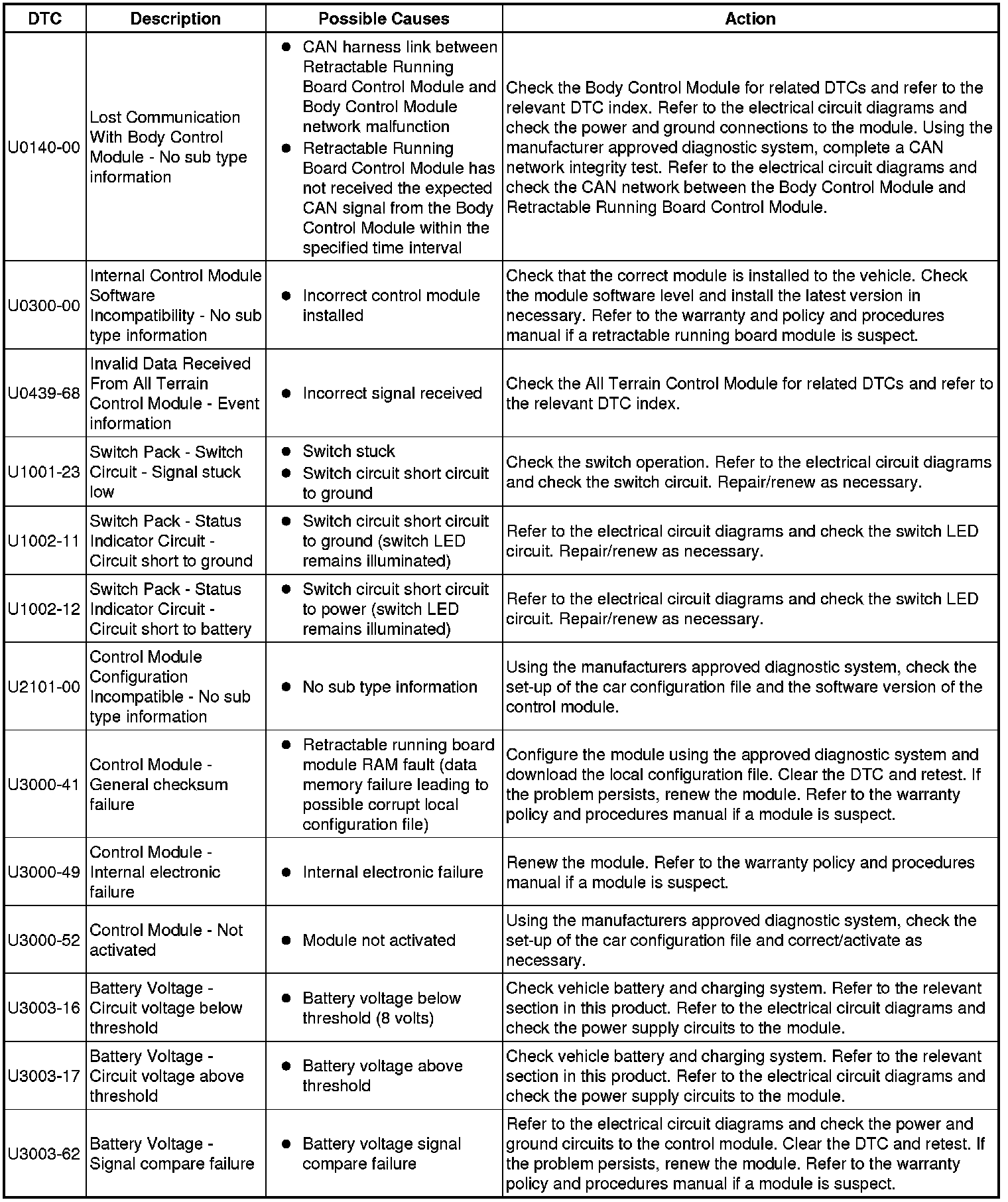 The table below lists all Diagnostic Trouble Codes (DTCs) that could be logged in the Retractable Running Board Module, for additional Diagnosis and Testing information refer to the relevant Diagnosis and Testing Section. For additional information, refer to Retractable Running Board Testing and Inspection