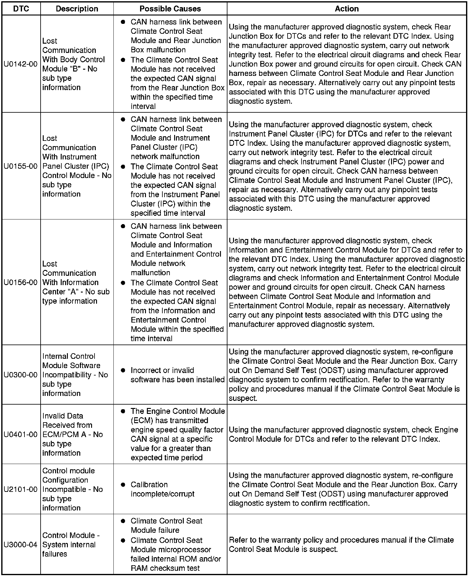 The table below lists all Diagnostic Trouble Codes (DTCs) that could be logged in the Climate Controlled Seat Module - Front/Rear (SCME/SCMF), for additional Diagnosis and Testing information refer to the relevant Diagnosis and Testing Section. For additional information, refer to Seats Initial Inspection and Diagnostic Overview