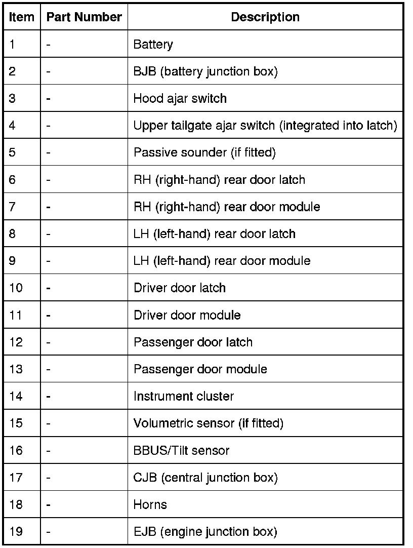 The active anti-theft system monitors the hinged panels for unauthorized opening. On some vehicles, the active anti-theft system also incorporates interior monitoring and vehicle tilt sensing functions. If an alarm event is detected, the active anti-theft system generates audible and visual alarm signals. The active anti-theft system is controlled by the CJB (central junction box) and is configured to automatically arm and disarm with operation of the CLS (central locking system). For additional information, refer to Handles, Locks, Latches and Entry Systems Description and Operation