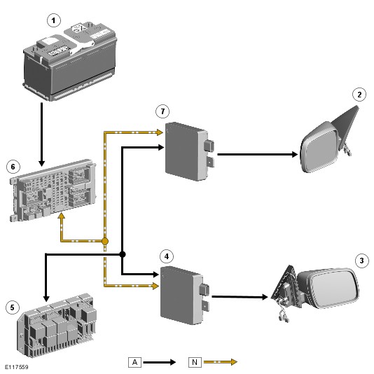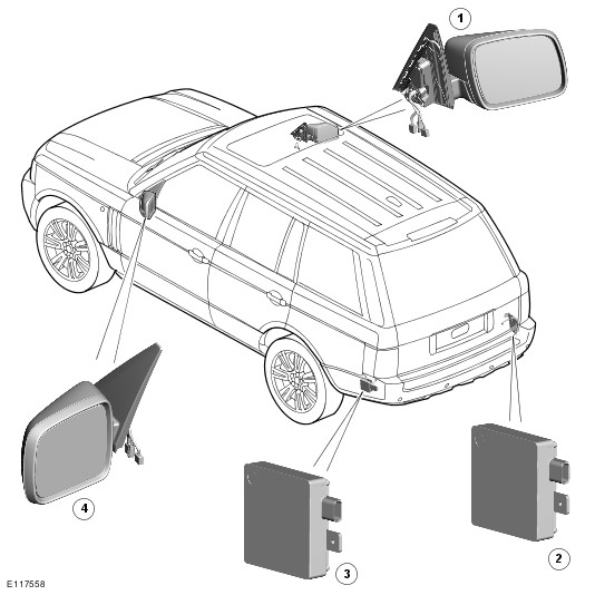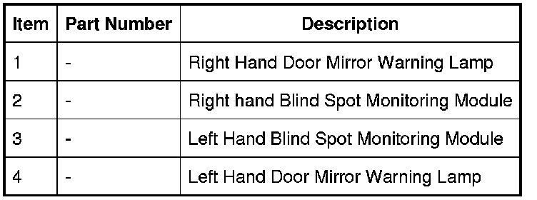 When the system initiates, it performs a self-check, during which the warning icons in the mirrors illuminate alternately for a short period of time. Each module does a left/right determination check when the ignition is switched on. Each mirror has a different circuit configuration so that the modules can determine which mirror they are connected to. If a module detects the wrong mirror it will go into a fault condition.