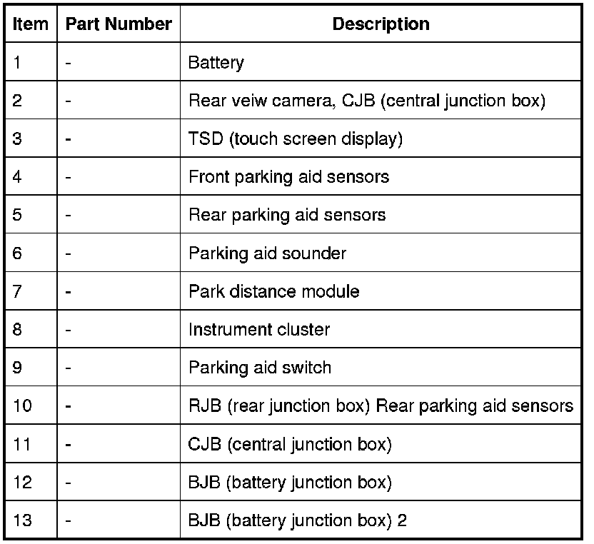 The parking aid system provides an audible warning to the driver when any obstacles are in the path of the vehicle during forward and reverse parking maneuvers. The system consists of 4 ultrasonic parking aid sensors in each bumper, a control module, a sounder and a switch. The system also uses the sounder driven by the instrument cluster.