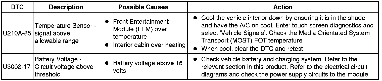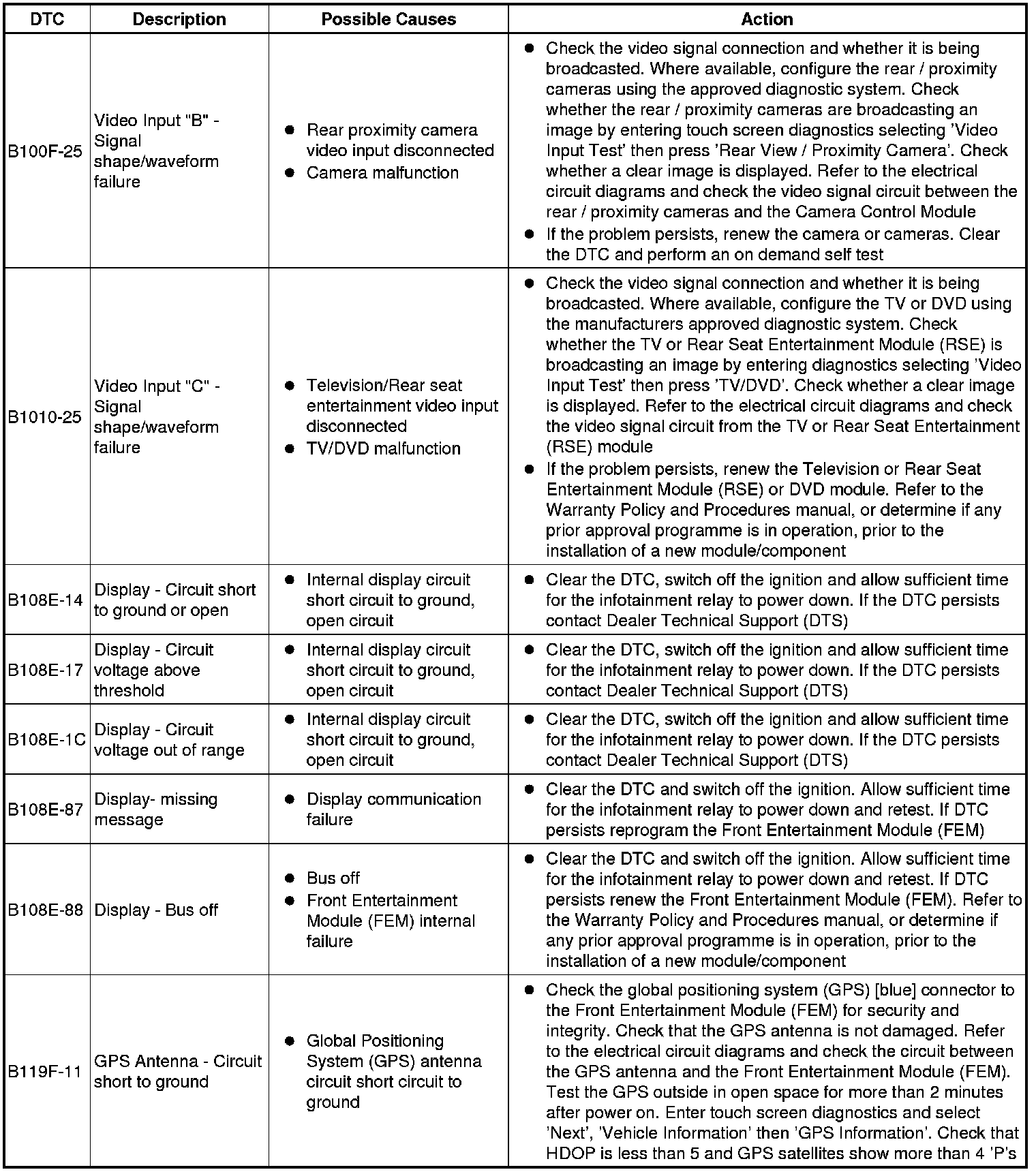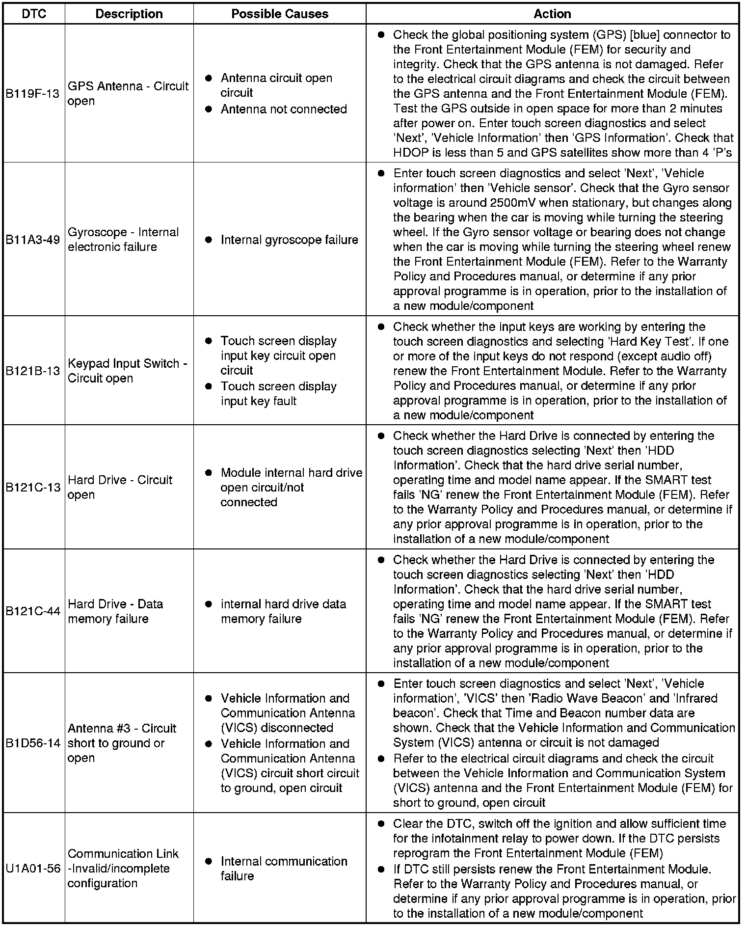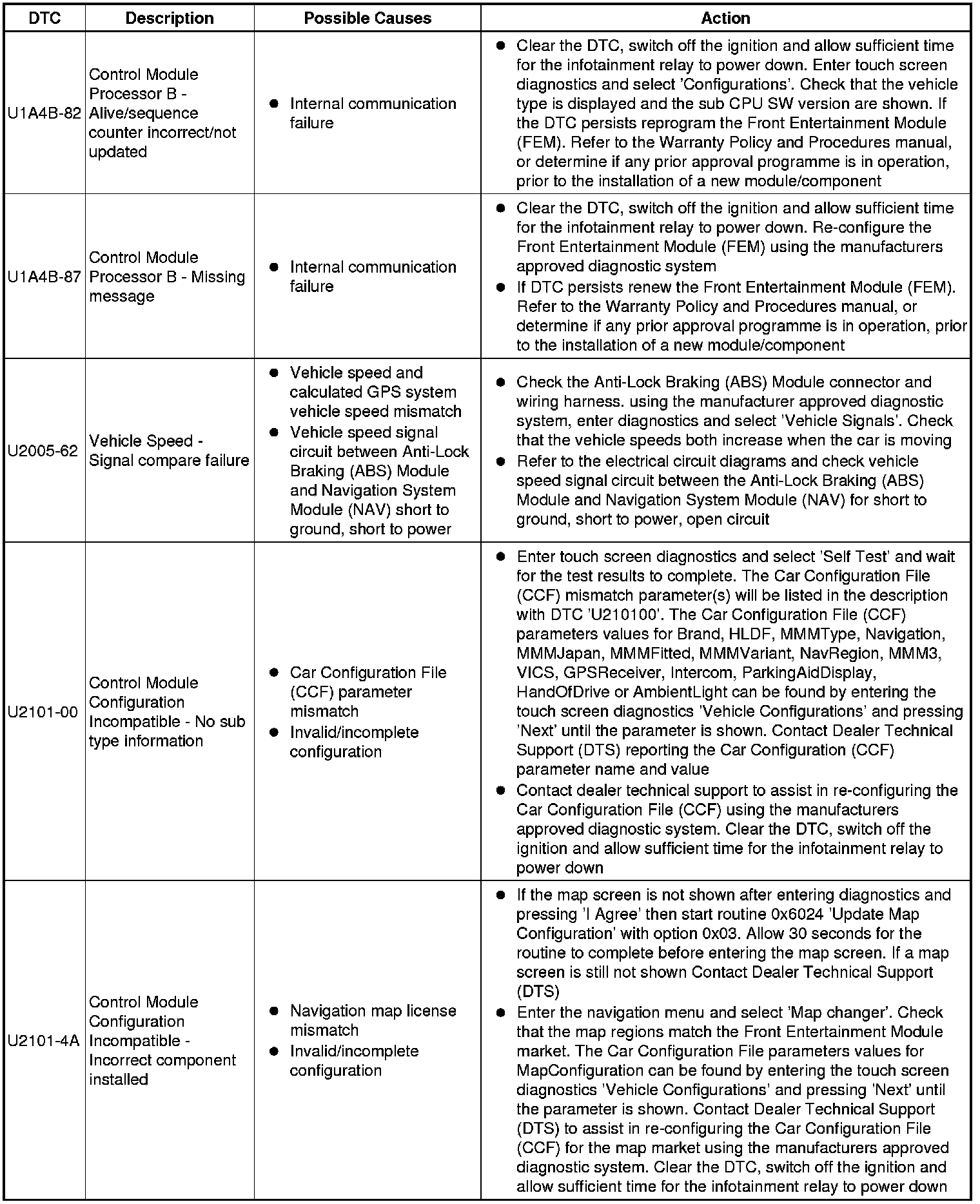 The table below lists all Diagnostic Trouble Codes (DTCs) that could be logged in the Touch Screen Display (TSD) for additional Diagnosis and Testing information refer to the Navigation System, Section 415-00.